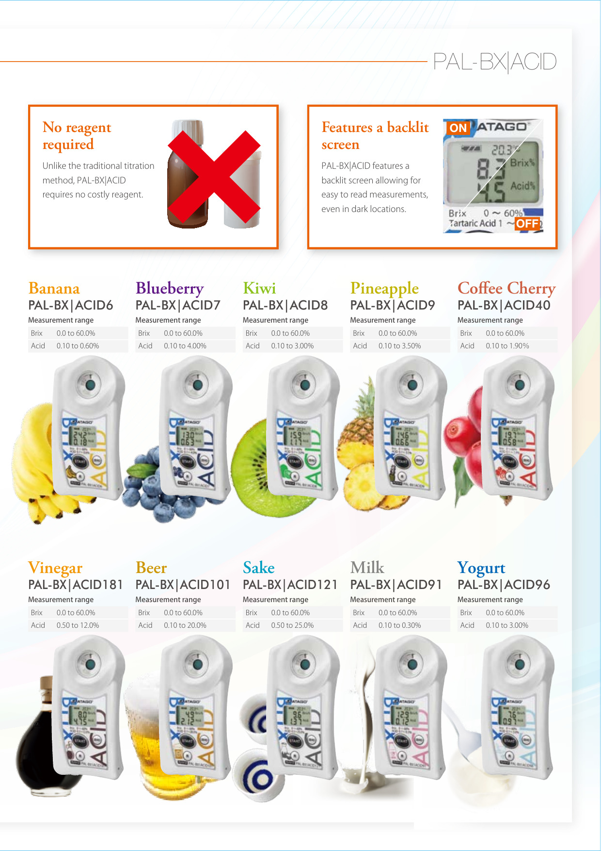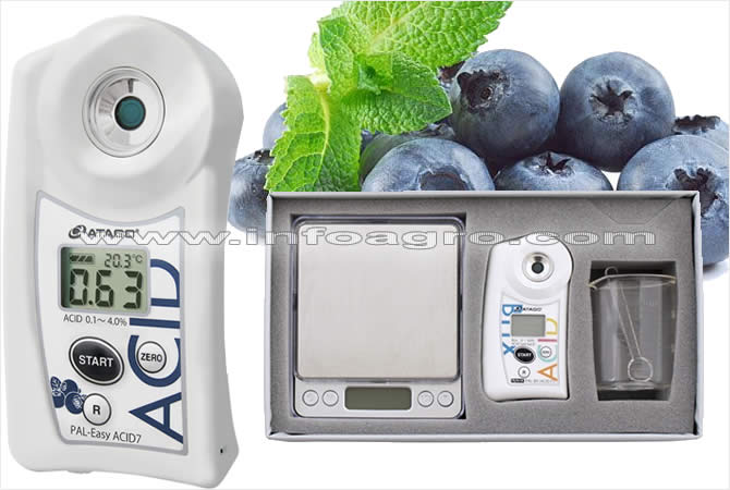 PAL-BX / ACID 7 es un instrumento combinado de medición de la acidez y el contenido de azúcar para medir el índice de acidez en los arándanos y el índice de refracción en una escala de% Brix. Un dispositivo único que no tiene análogos en el mundo! Este dispositivo no utiliza reactivos y consumibles. Además, este dispositivo también puede funcionar en el modo de refractómetro. Puedes medir tanto la acidez de los arándanos como su contenido de azúcar. Se puede utilizar para determinar la proporción de azúcar y ácido (proporción de azúcar / ácido). Se puede suministrar completo con balanzas digitales y 2 vasos de plástico (Master Kit, cat.