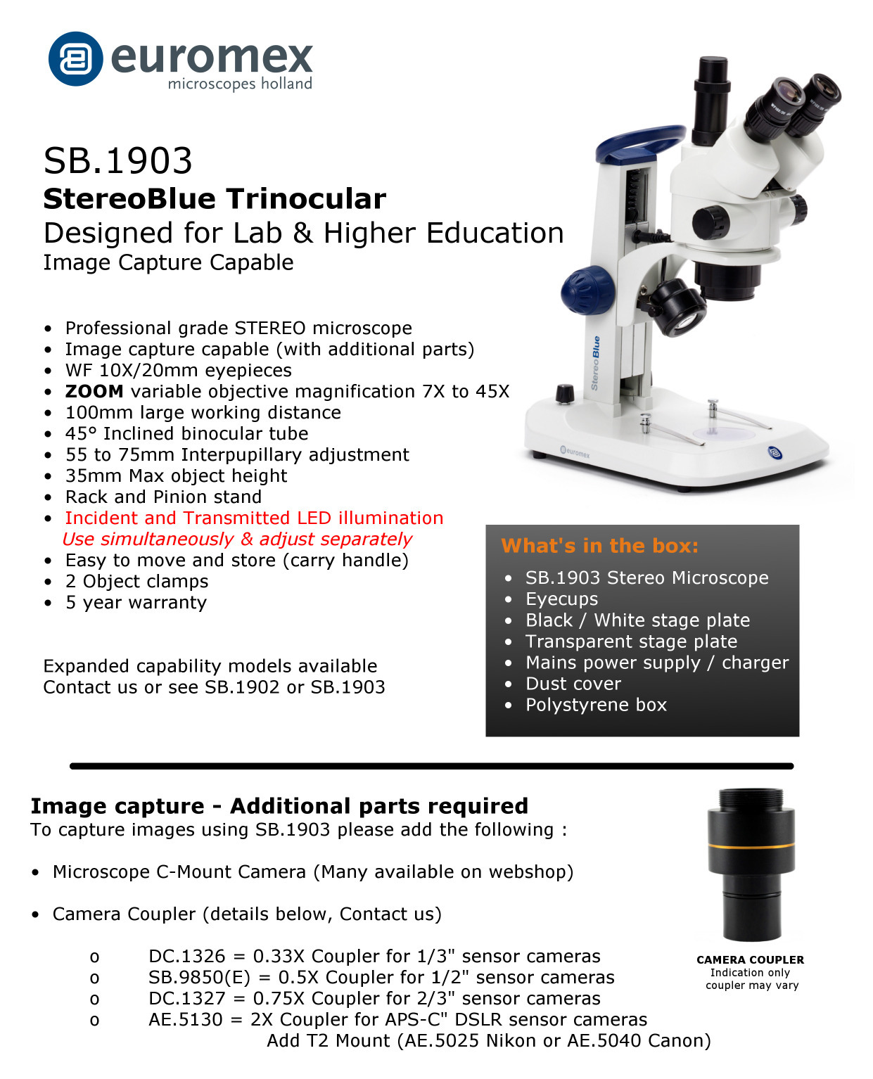 Se puede elegir entre modelos con un cabezal binocular o trinocular y con objetivos fijos 10x/30x o 20x/40x en una torreta giratoria o el modelo con aumentos variables zoom de 7x a 45x. Suministrado en configuración estándar con oculares WF10x/20 mm con tornillos de seguridad