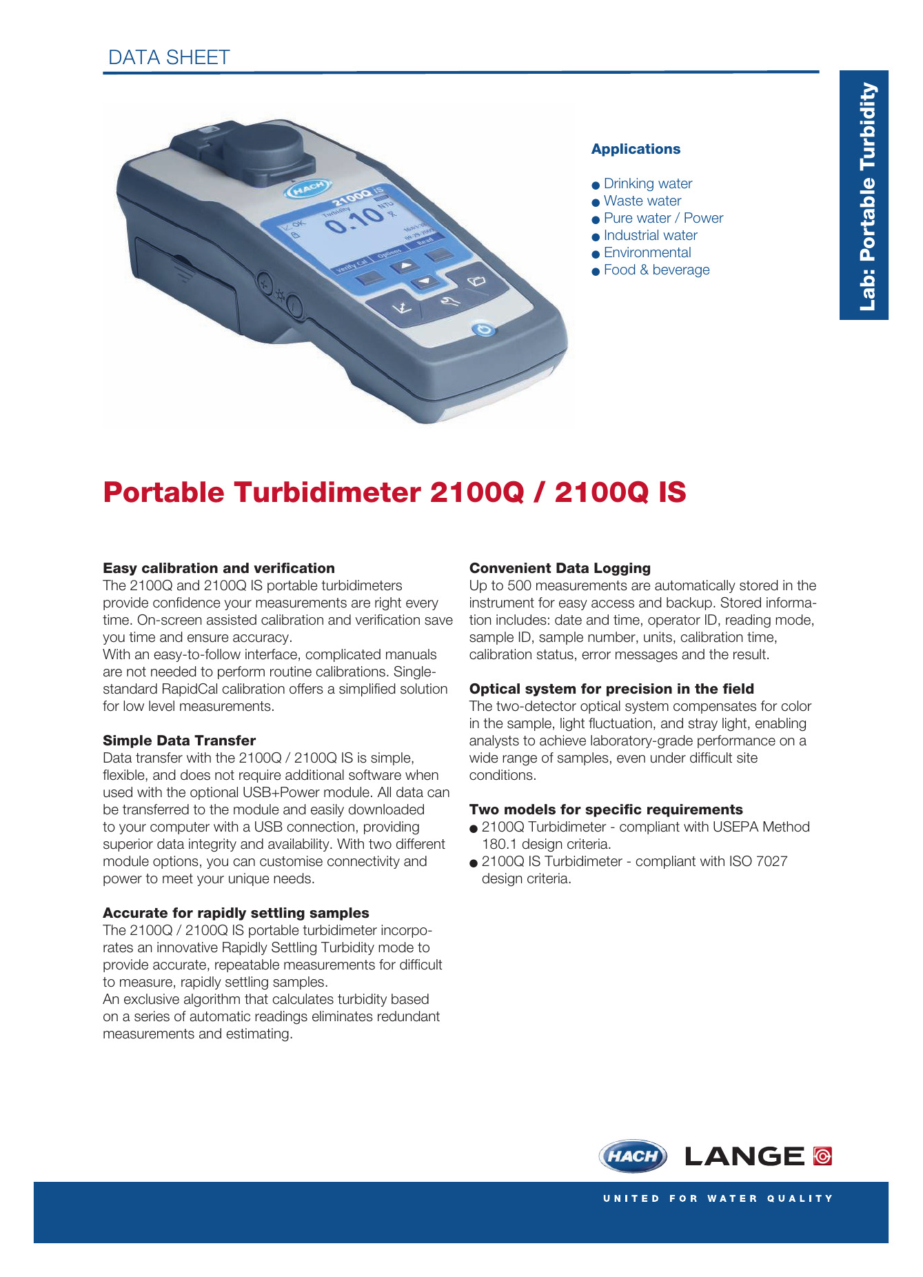 Los turbidímetros portátiles HACH 2100Q y 2100Q IS proporcionan confianza en que sus mediciones son correctas en todo momento. La calibración y verificación asistida en pantalla le ahorran tiempo y garantizan la precisión. Con una interfaz fácil de seguir, no se necesitan manuales complicados para realizar calibraciones de rutina. La calibración única de RapidCal ofrece una solución simplificada para mediciones de bajo nivel.