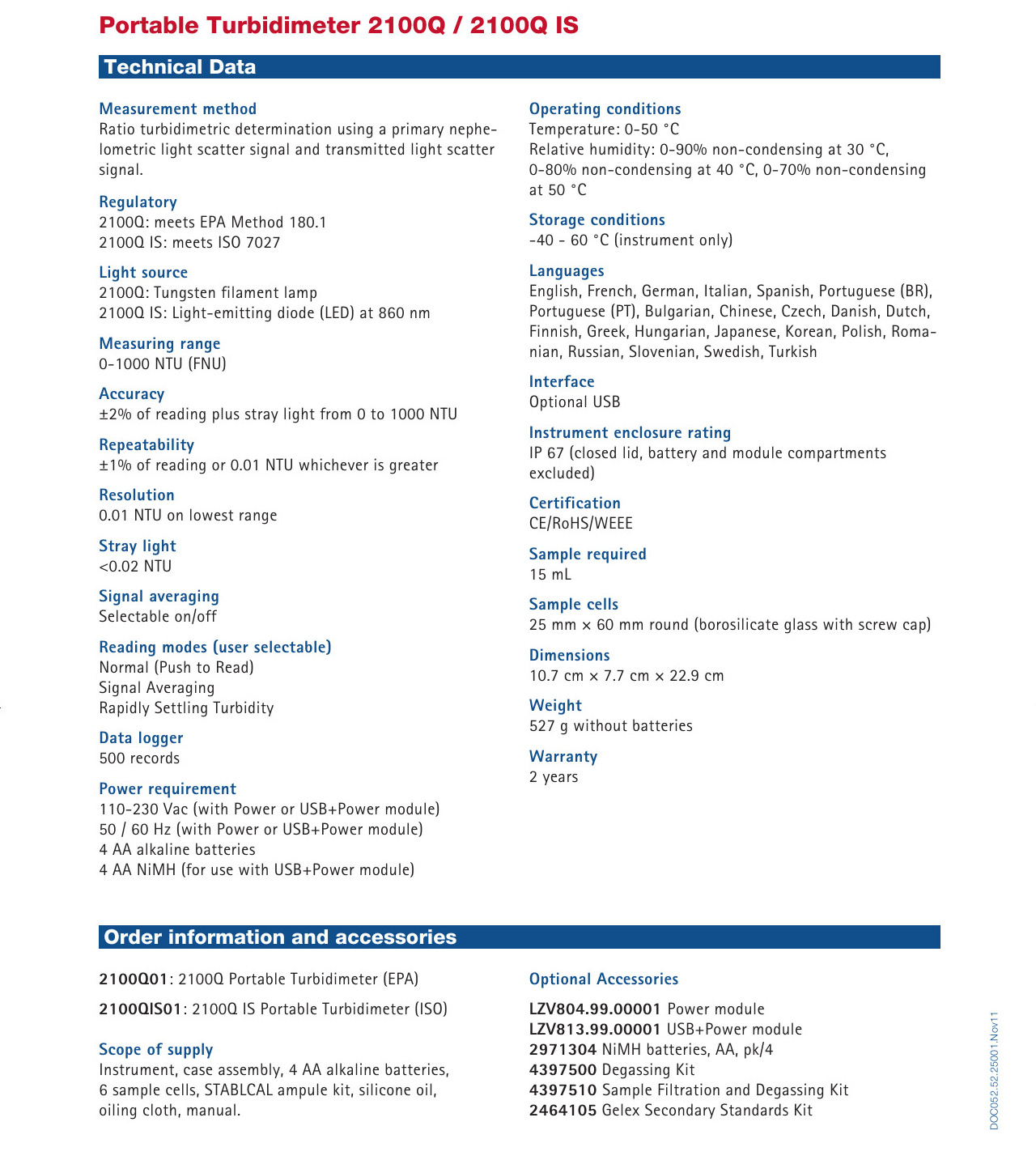 El turbidímetro portátil 2100Q ofrece una gran facilidad de uso y exactitud en la medición de la turbidez. Sólo Hach ofrece esta combinación única de caracterísitcas avanzadas e innovación en la medición, ofreciendo unos resultados exactos en todo momento.
