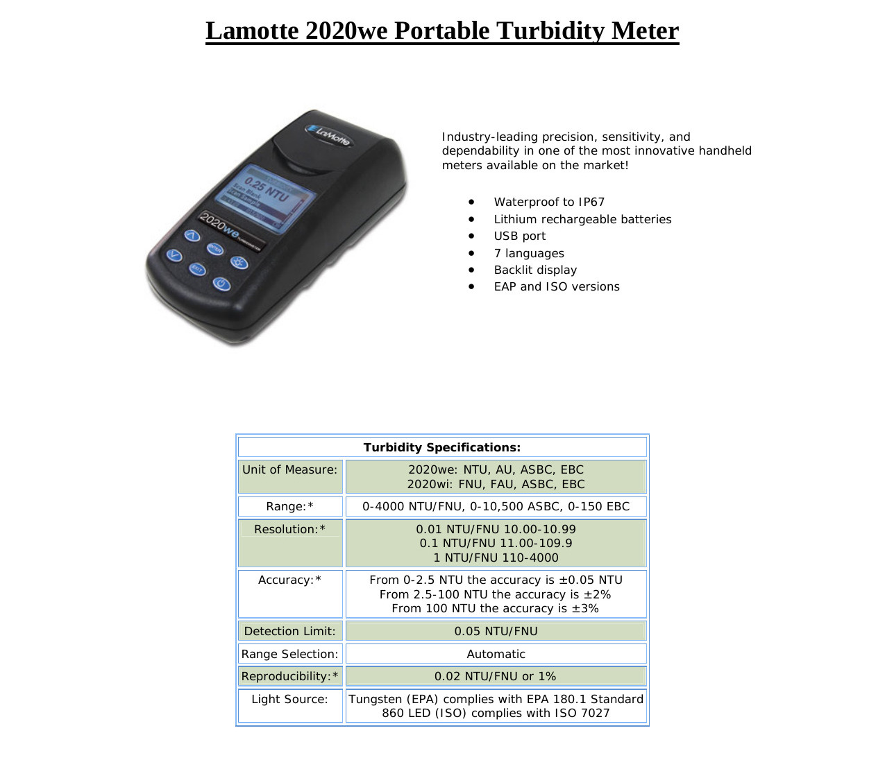 TURBIDIMETROS – > MARCA: LAMOTTE -> MODELO: 2020WE ; realizamos entrega en las ciudades de Lima, Arequipa, Cusco , Moquegua , Tacna , Ica , Chiclayo , Trujillo, Cajamarca, Piura, Tumbes, iquitos, Huancayo , Ayacucho , Pucallpa, Huanuco , Cerro de Pasco ; llevamos mas de 10 años comercializando LAMOTTE en Peru , somos especialistas importando turbidimetros, equipos de medicion , turbidimetro portatil, turbidimetro digitalTurbidímetro Portátil Nefelométrico Digital marca LAMOTTE – 1970-EPA 2020WE