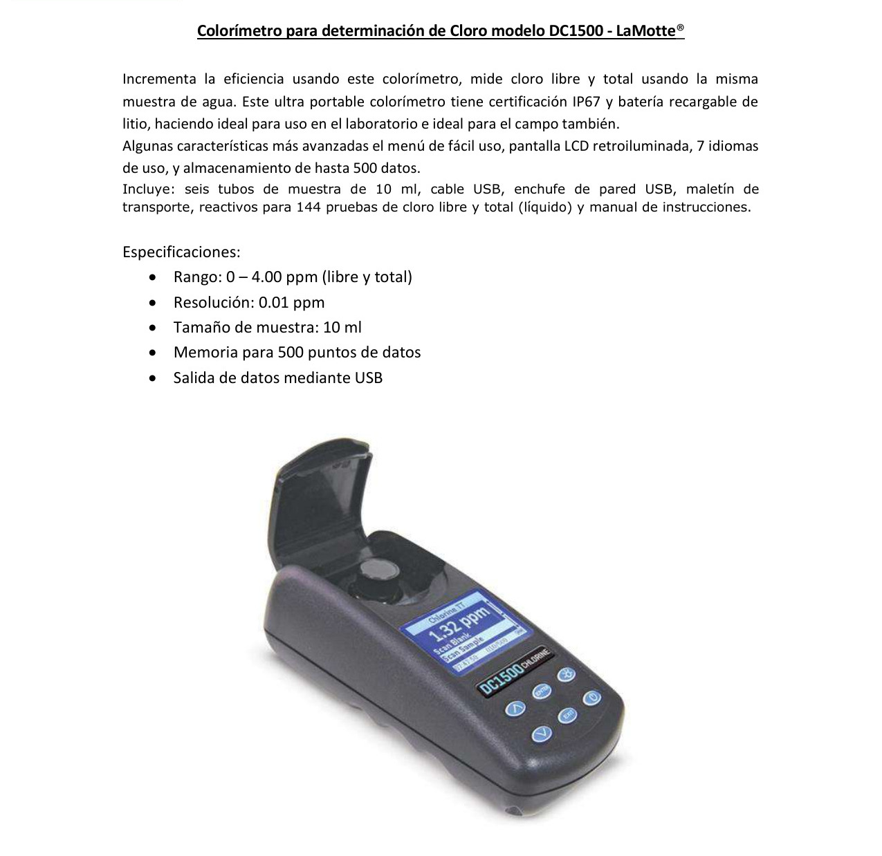 FOTOMETRO – > MARCA: LAMOTTE -> MODELO: DC1500 ; realizamos entrega en las ciudades de Lima, Arequipa, Cusco , Moquegua , Tacna , Ica , Chiclayo , Trujillo, Cajamarca, Piura, Tumbes, iquitos, Huancayo , Ayacucho , Pucallpa, Huanuco , Cerro de Pasco ; llevamos mas de 10 años comercializando LAMOTTE en Peru , somos especialistas importando fotometro, equipos de medicion , fotometro de cloro libre y cloro total , fotometro portatilFotómetro de cloro libre y cloro total DC1500 LAMOTTE – 3240