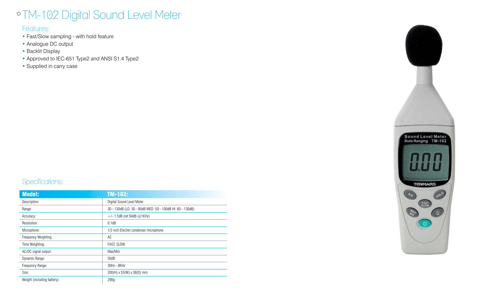 El medidor de nivel de sonido Tenmars TM-102 ha sido diseñado para cumplir con los requisitos de medición de los ingenieros de seguridad, salud, oficinas de seguridad industrial y control de calidad en diversos entornos.