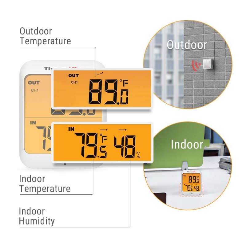Equipado con sensores de interior / exterior de calidad profesional, el termómetro digital para interiores ThermoPro TP63 monitorea las condiciones ambientales en 4 ubicaciones dentro y fuera de su hogar desde 200 pies / 60 m de distancia. La audaz pantalla LCD, fácil de leer, muestra la temperatura interior y exterior exactas y la humedad y la humedad interior con información alta / baja durante las últimas 12 horas y en todo momento. El sensor para exteriores cuenta con una potente tecnología inalámbrica, un diseño recargable y resistente a la intemperie y un soporte integrado para un montaje fácil.