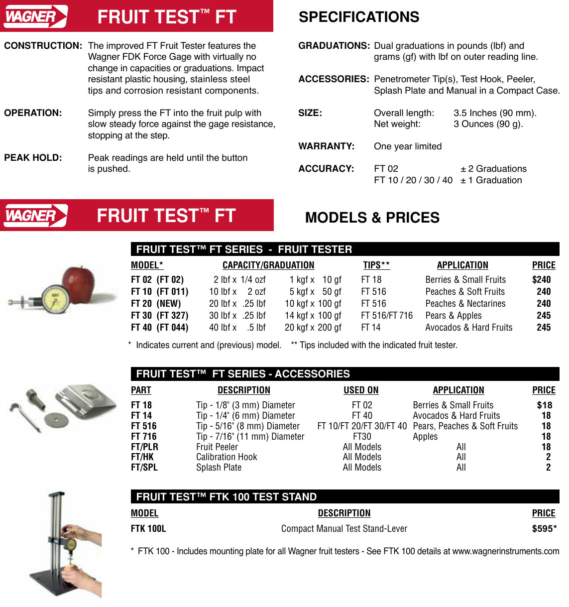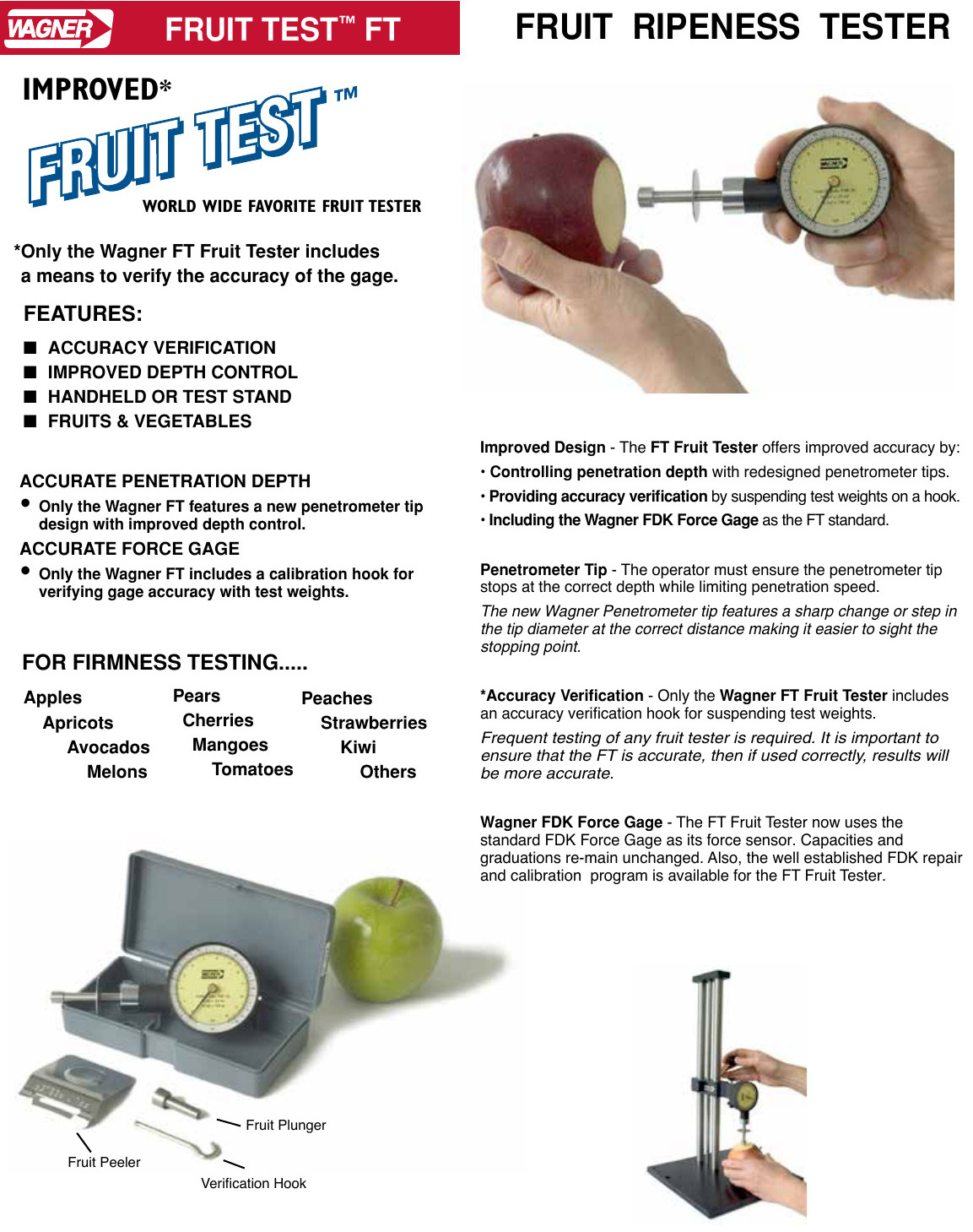 Penetrómetro para la medición de la dureza de las frutas que es un indicativo de la maduréz para corte, almacenamiento y venta. El nuevo penetrómetro de Wagner Instruments incluye una punta de nuevo diseño con control de penetración.Construcción: El penetrómetro FT mejorado incluye un medidor de fuerza FDK que elimina las variaciones en capacidad o graduación. La carcasa es de plástico aprueba de impactos y las puntas son de acero inoxidable rersistente a la corrosión