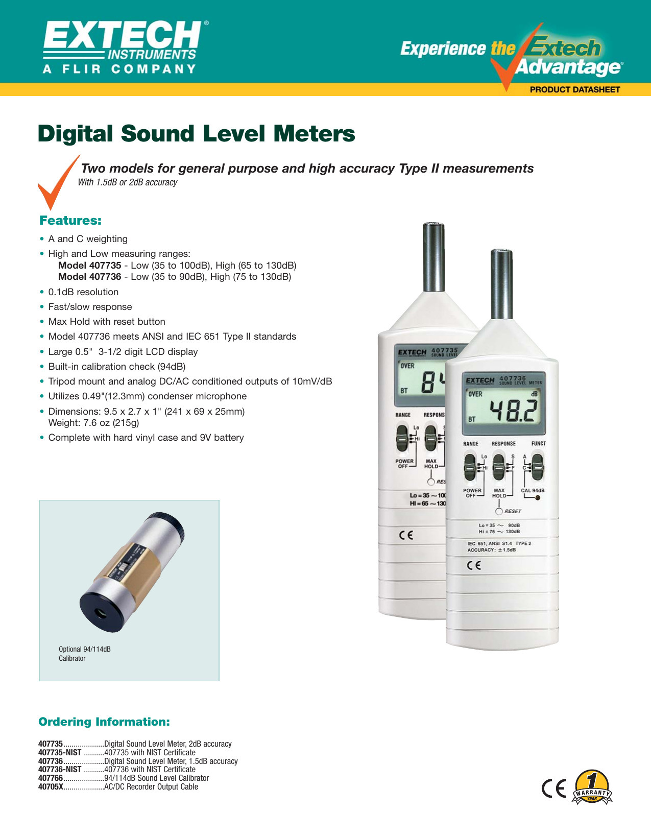 Características principales del medidor de nivel de sonido de rango doble 407736 tipo 2 de Extech