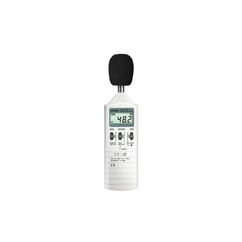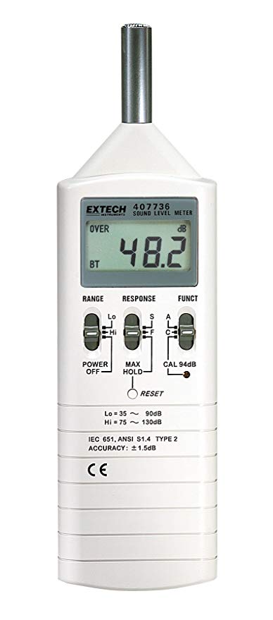 Un medidor de nivel de sonido de tipo 2, el 407736 de Extech se puede utilizar para medir la cantidad de sonido en un espectro extremadamente amplio.