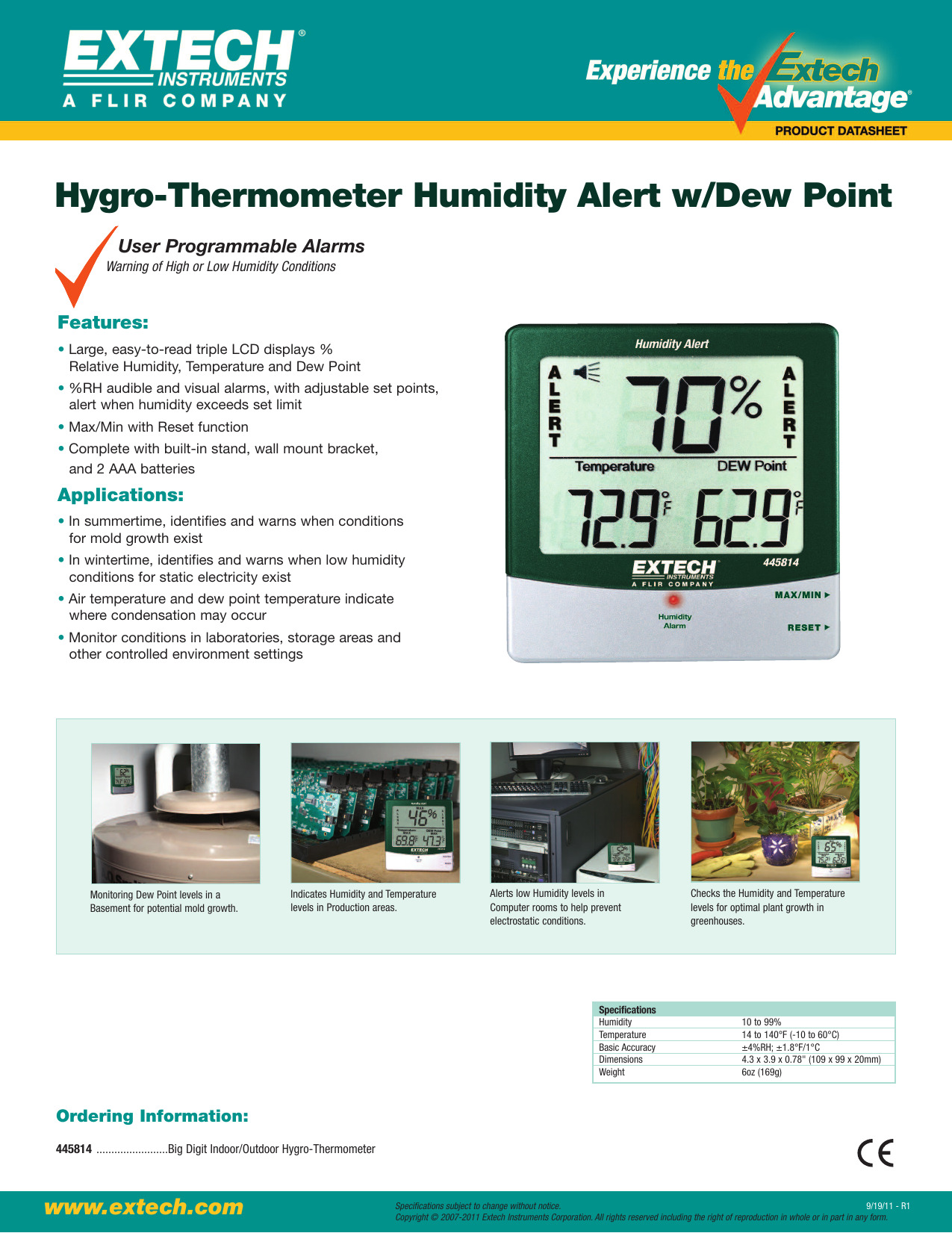 Las aplicaciones incluyen condiciones de monitoreo en laboratorios, áreas de almacenamiento y otras configuraciones de ambiente controlado, temperatura del aire y temperatura del punto de rocío donde puede ocurrir condensación. En verano, identifica y advierte cuando existen condiciones para el crecimiento de moho, y en el invierno, identifica y advierte cuando existen condiciones de baja humedad para la electricidad estática.