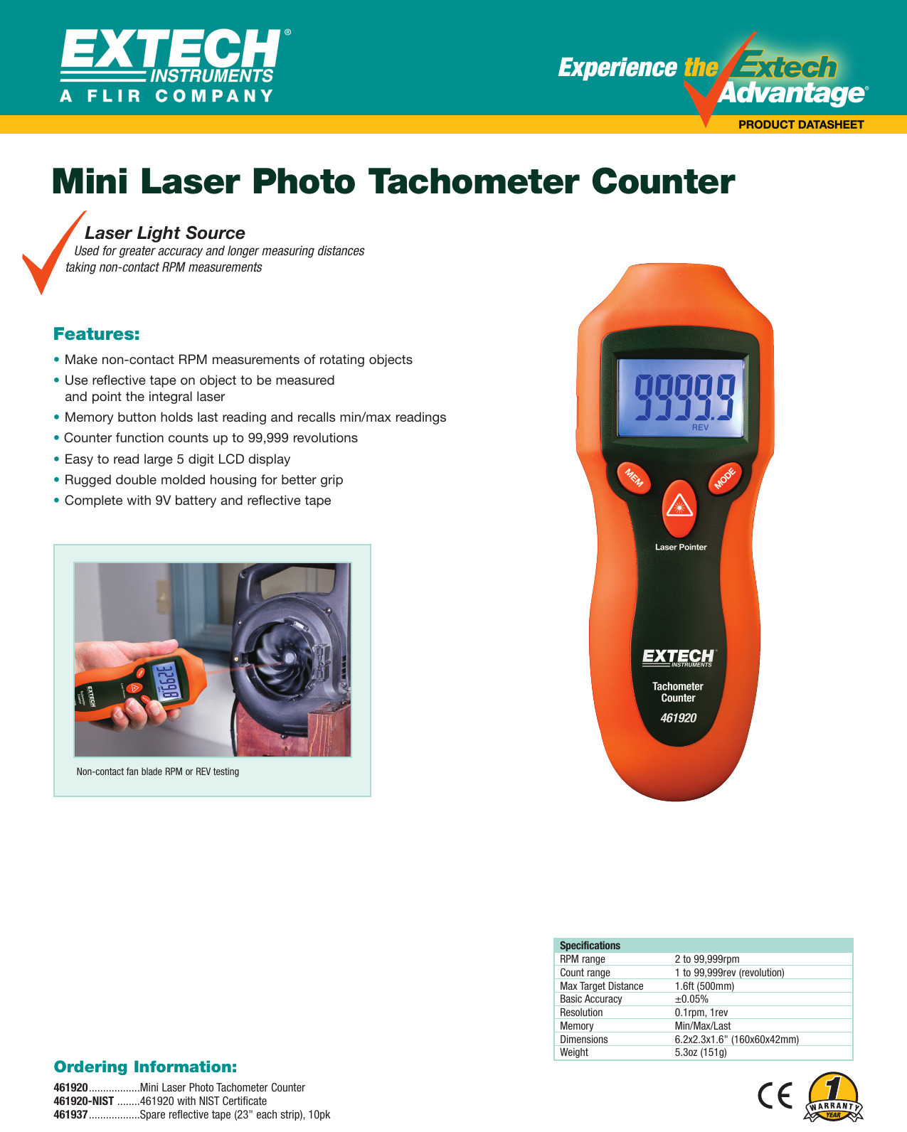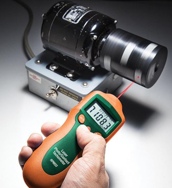 El 461920 CAL de Extech Instruments es un contador de mini tacómetro fotográfico láser. Fuente de luz láser utilizada para mayor precisión y mayor distancia de medición que toma mediciones de RPM sin contacto. Realice mediciones seguras de RPM sin contacto (2 a 99,999 RPM) de los objetos giratorios apuntando el láser integral (distancia objetivo de 1.6 pies) hacia la cinta reflectante colocada en el objeto que se medirá. Proporciona RPM sin contacto y mediciones de conteo. El haz del puntero láser proporciona mediciones precisas a larga distancia para mediciones de fotómetro tacómetro. Este medidor se envía completamente probado y calibrado y con el uso adecuado.