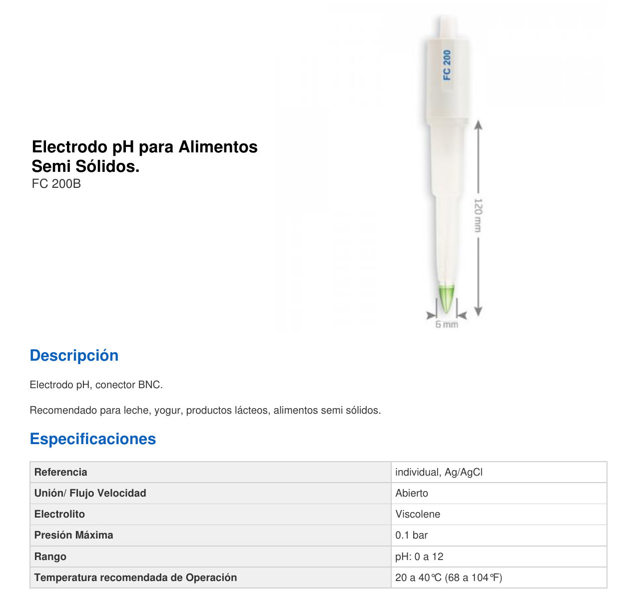 El FC200B usa vidrio de baja temperatura (LT), bulbo cónico, cuerpo de PVDF de grado alimenticio y unión abierta con electrolito en gel de viscolene.