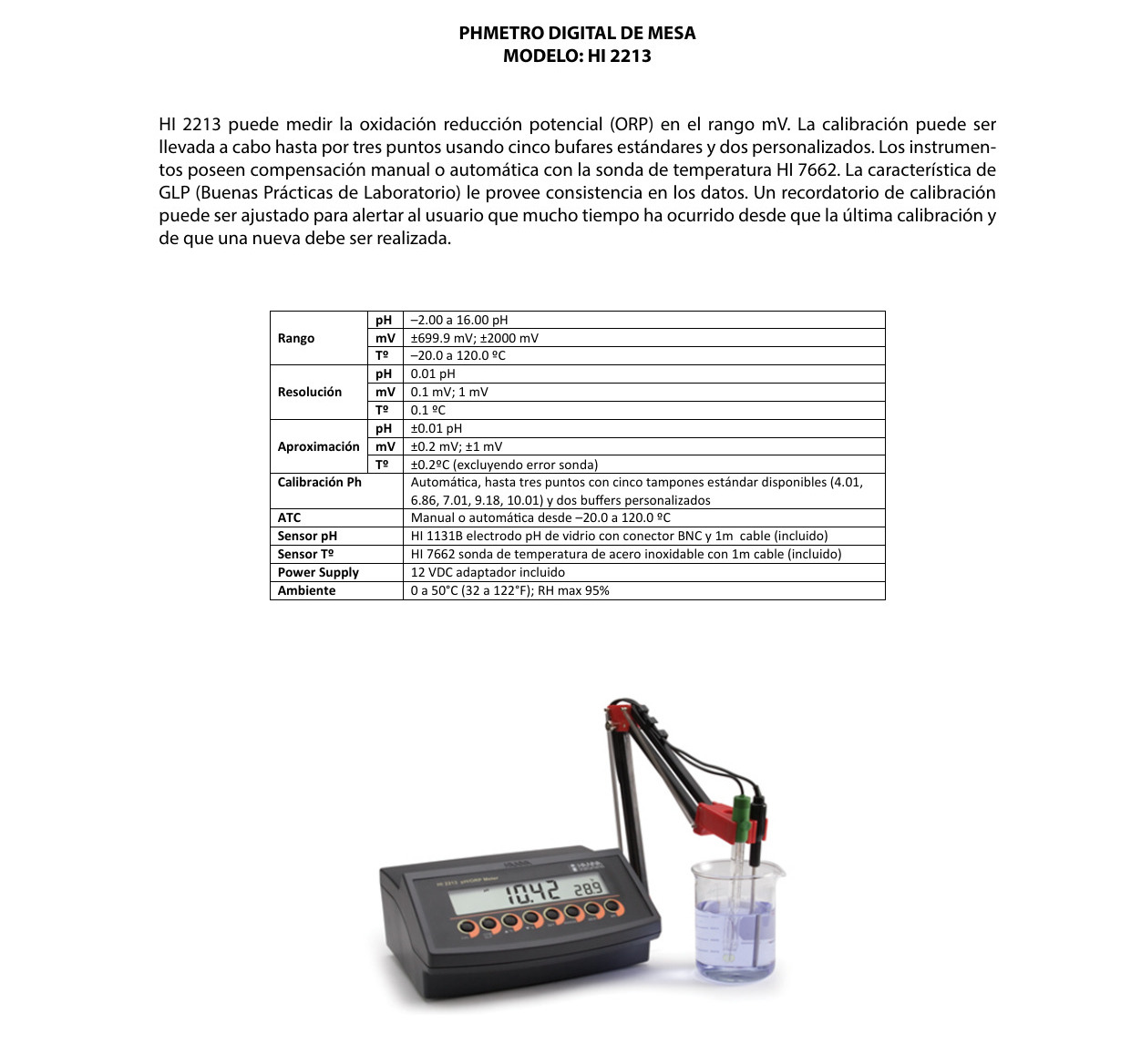 El HI 2213 es un medidor de mesa de pH y temperatura adecuado para uso de laboratorio. El medidor también puede medir el potencial de reducción de oxidación (ORP) en el rango de mV y se proporciona una característica relativa de mV. Cuenta con una sonda de pH y temperatura, una pantalla LCD y una Compensación de temperatura manual o automática (ATC). Se puede configurar un recordatorio de calibración para alertar al usuario cuando haya transcurrido demasiado tiempo desde la última calibración de pH y se debe realizar una nueva.