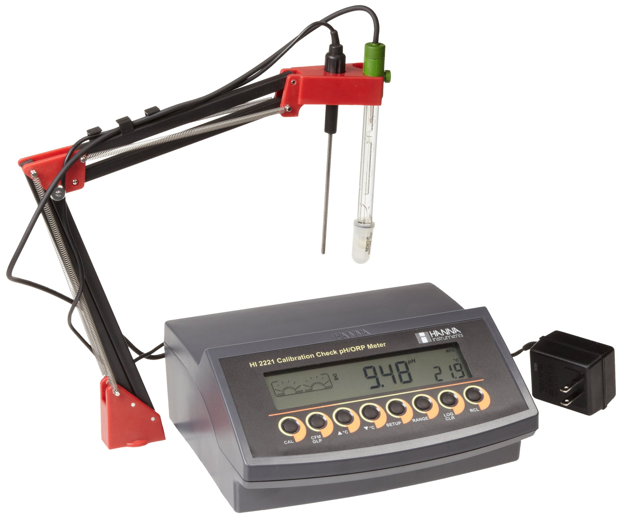 El rango de pH es de -2.00 a 16.00 (+ o – 0.01 pH a 20 grados C) con una resolución de 0.01 pH. el rango mV es + o – 699.9; 2000 (+ o – 0.2 mV; 1 mV) con una resolución de 0.1 mV; 1 mV. El rango de temperatura es de -20.0 a 120.0 grados C + o – 0.2 grados C (excluyendo el error de la sonda) con una resolución de 0.1 grados C. La impedancia de entrada es de 1012 ohmios y el dispositivo funciona con un adaptador de 12 VCC. Las dimensiones son 235 x 222 x 109 mm / 9.2 “x 8.7″ x 4.3 ” (H x W x D), y pesa 1.3 kg (2.9 lbs.).