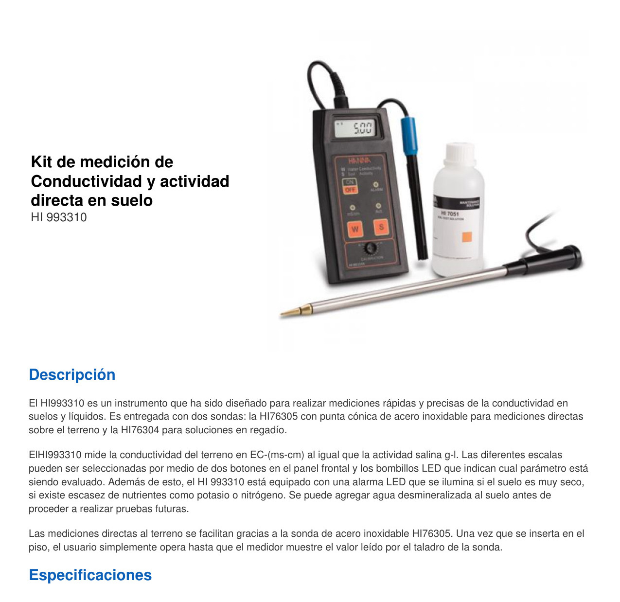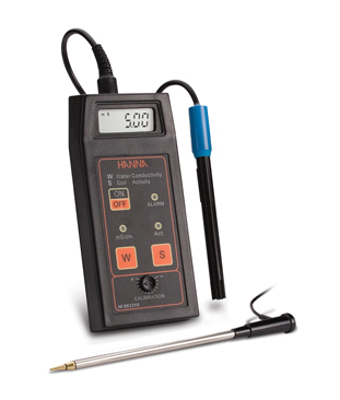 El HI993310 es un instrumento que ha sido diseñado para realizar mediciones rápidas y precisas de la conductividad en suelos y líquidos. Es entregada con dos sondas: la HI76305 con punta cónica de acero inoxidable para mediciones directas sobre el terreno y la HI76304 para soluciones en regadío.