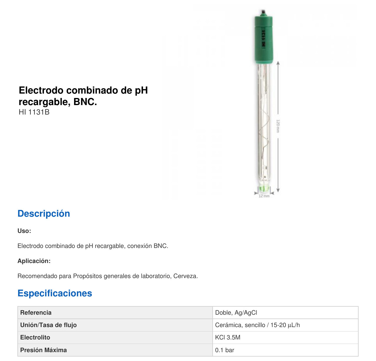 Es un electrodo de pH de punta esférica, indicado para usos generales de laboratorio y cerveza.