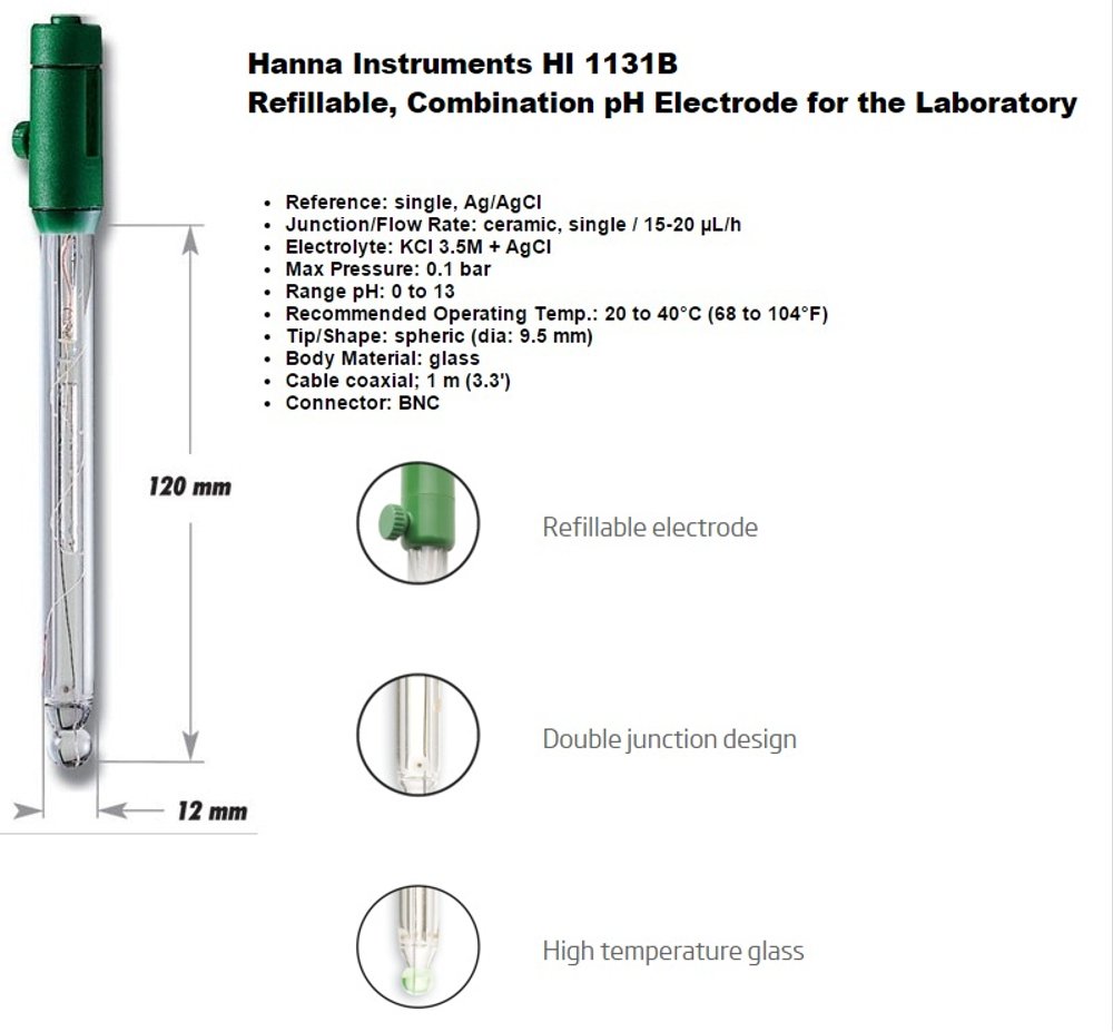El HI1131B utiliza vidrio de alta temperatura, bulbo esférico, frita de cerámica sencilla, doble unión y puede rellenarse con cloruro de potasio 3.5 M.