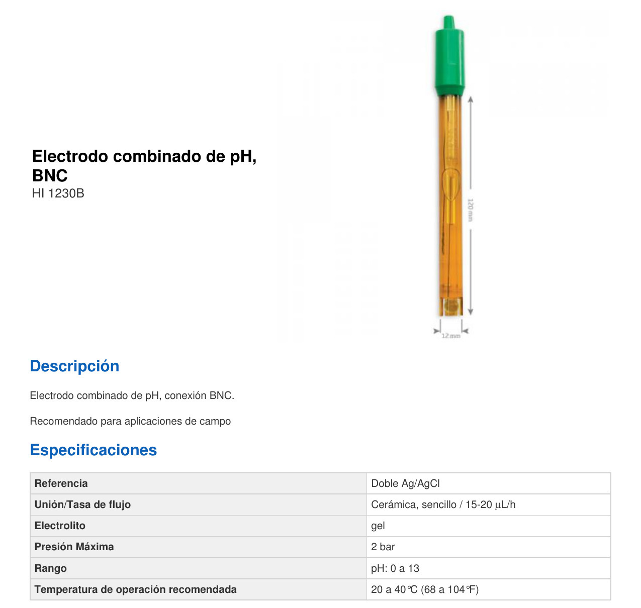 El electrodo de pH HI1230B para campo utiliza vidrio de uso general (GP), bulbo esférico, cuerpo de polieterimida (PEI), frita cerámica simple y unión doble.
