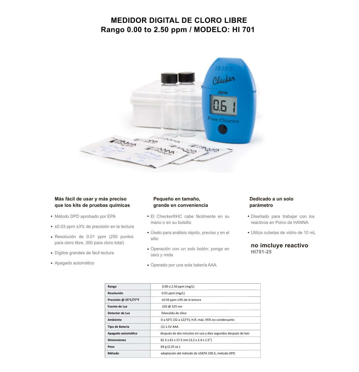 El HI701 Checker ® HC (colorímetro de mano) es una manera simple, exacta y rentable de medir el cloro libre. El cloro libre es la forma activa de cloro que se utiliza para la desinfección del agua potable, piscinas, spas, y el agua de enjuague vegetal. El cloro libre en el agua es dañino para las membranas de ósmosis inversa y necesita ser supervisado para removerlo del agua de la fuente antes de ser usado. Diseñado como una alternativa más precisa a los kits de pruebas químicas, el HI701 proporciona resultados rápidos y exactos en unos sencillos pasos.