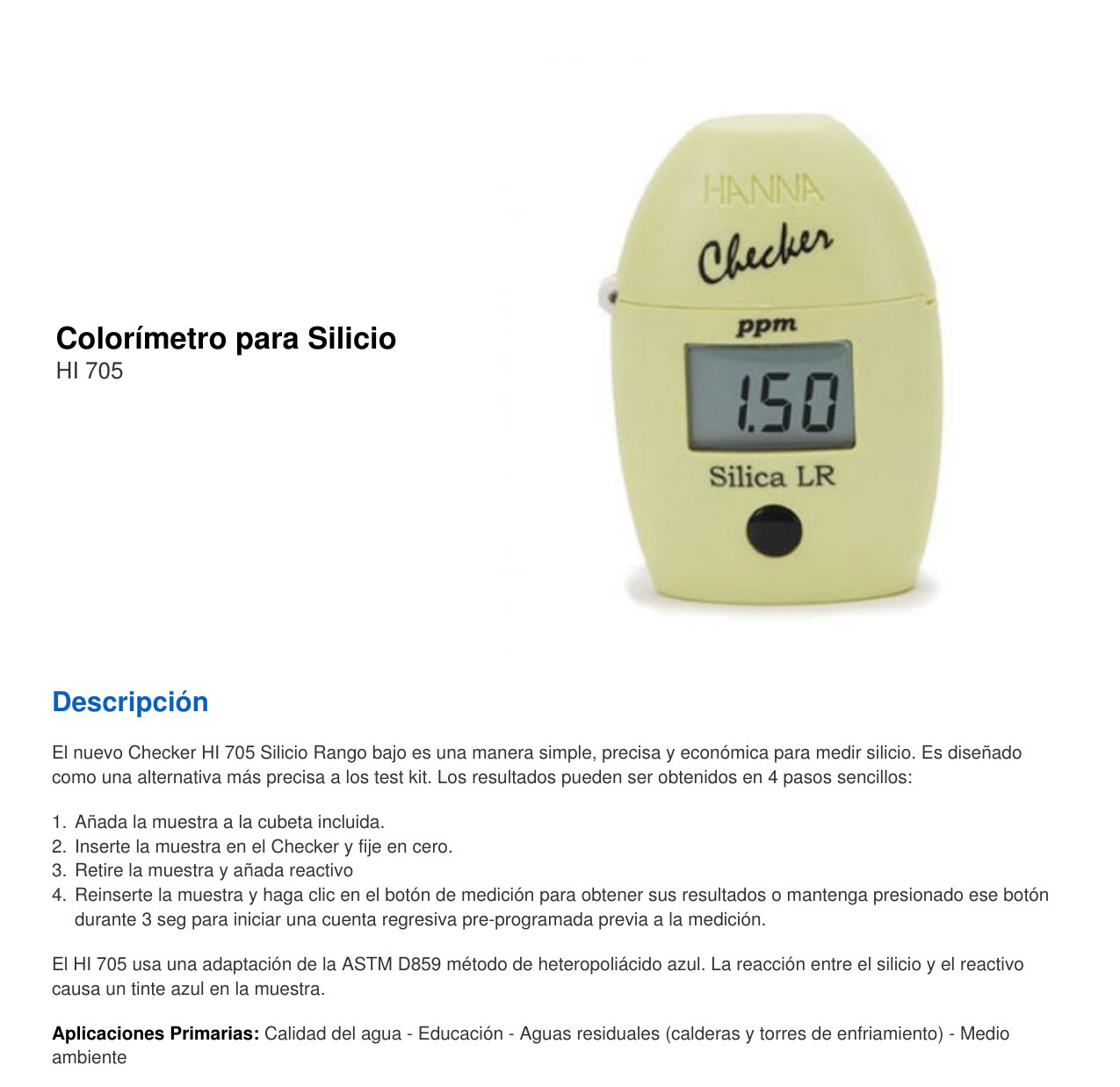 El nuevo Checker HI 705 Silicio Rango bajo es una manera simple, precisa y económica para medir silicio. Es diseñado como una alternativa más precisa a los test kit. Los resultados pueden ser obtenidos en 4 pasos sencillos: