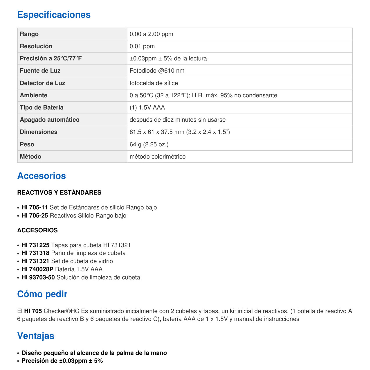 El HI705 Checker ® HC (colorímetro de mano) ofrece una manera simple, precisa y económica de medir la sílice. La sílice se encuentra en todas las aguas naturales en forma disuelta. Debido a la posibilidad de causar incrustaciones, no es deseable y, por lo tanto, se controla en aplicaciones industriales y en sistemas de calefacción y ósmosis inversa. Diseñado como una alternativa más precisa a los kits de pruebas químicas, el HI705 brinda resultados rápidos y precisos en unos pocos y sencillos pasos.