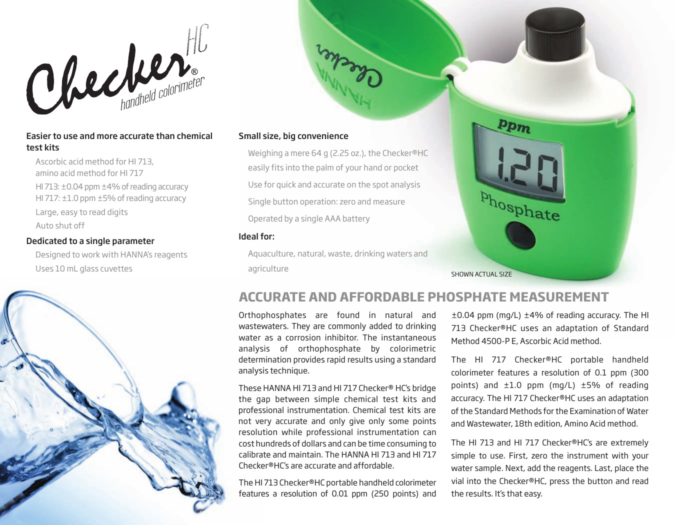 El HI713 Comprobador ® HC (orientable Colorímetro) proporciona una manera simple, precisa y rentable para medir fosfato. El fosfato es un aditivo alimentario común que mejora el sabor y actúa como un agente tamponante. Importante para el crecimiento y desarrollo de las raíces de las plantas, el fosfato también está presente en los fertilizantes. Sin embargo, las altas concentraciones de fosfatos son perjudiciales para el medio ambiente; Por este motivo, se monitorea de cerca en aguas naturales y municipales. Diseñado como una alternativa más precisa a los kits de pruebas químicas, el HI713 brinda resultados rápidos y precisos en unos pocos y sencillos pasos.