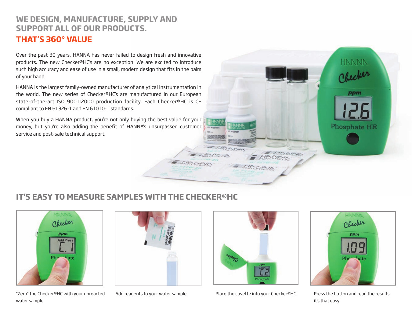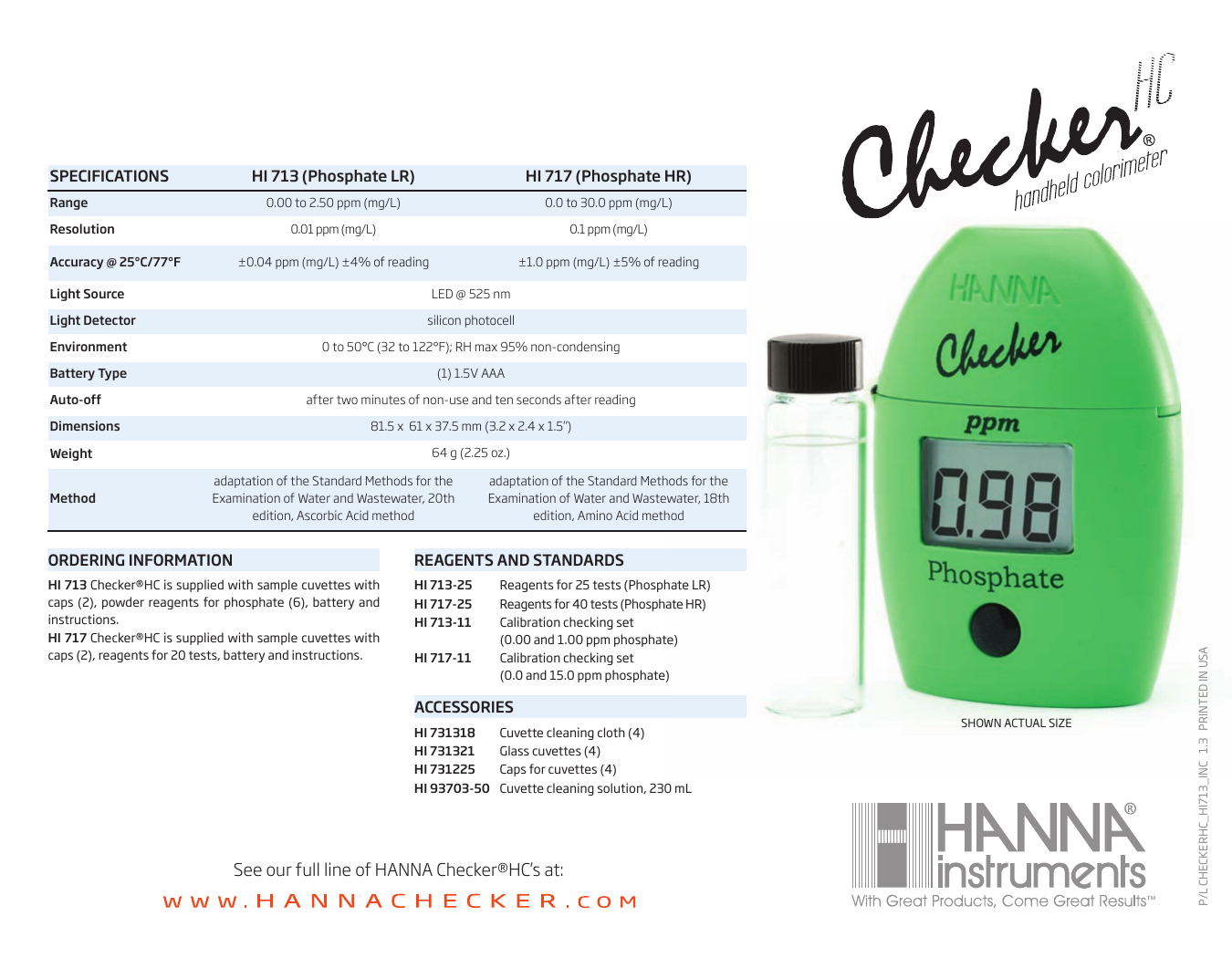 Información sobre pedidos HI713 Checker® se suministra con (2) cubetas de muestra con tapas, kit de inicio de reactivo de fosfato LR para 6 pruebas (6 paquetes de reactivo en polvo), batería, instrucciones y guía de inicio rápido.