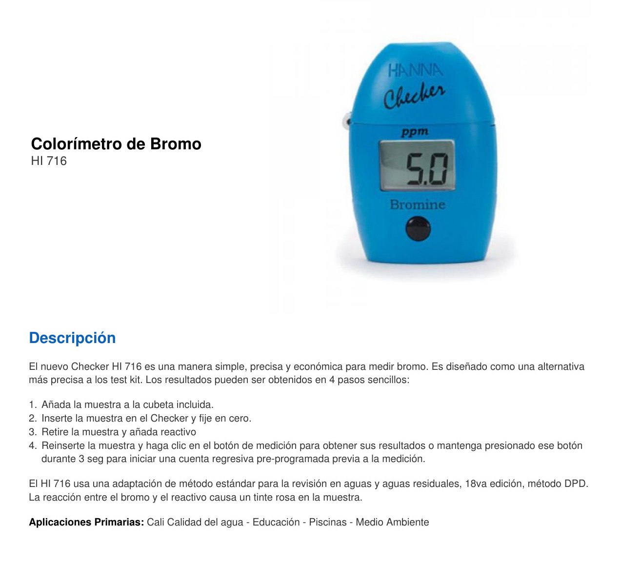 El HI716 Comprobador ® HC (orientable Colorímetro) proporciona una manera simple, precisa y rentable para medir bromo. Introducido como una alternativa al cloro, el uso de bromo como desinfectante está aumentando en uso en muchos países. El bromo es menos volátil y tiene resultados más efectivos por encima de un pH de 7.4, pero es un desinfectante de acción más lenta en general. Diseñado como una alternativa más precisa a los kits de pruebas químicas, el HI716 brinda resultados rápidos y precisos en unos pocos y sencillos pasos.