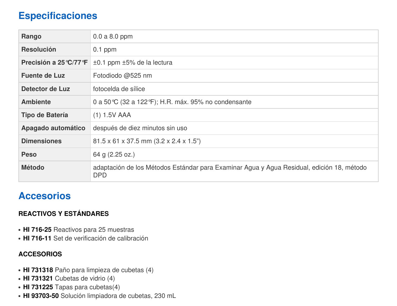 Información sobre pedidos HI716 Checker® se suministra con (2) cubetas de muestra con tapas, kit de inicio de reactivo de bromo para 6 pruebas (6 paquetes de reactivo de polvo), batería, instrucciones y guía de inicio rápido.