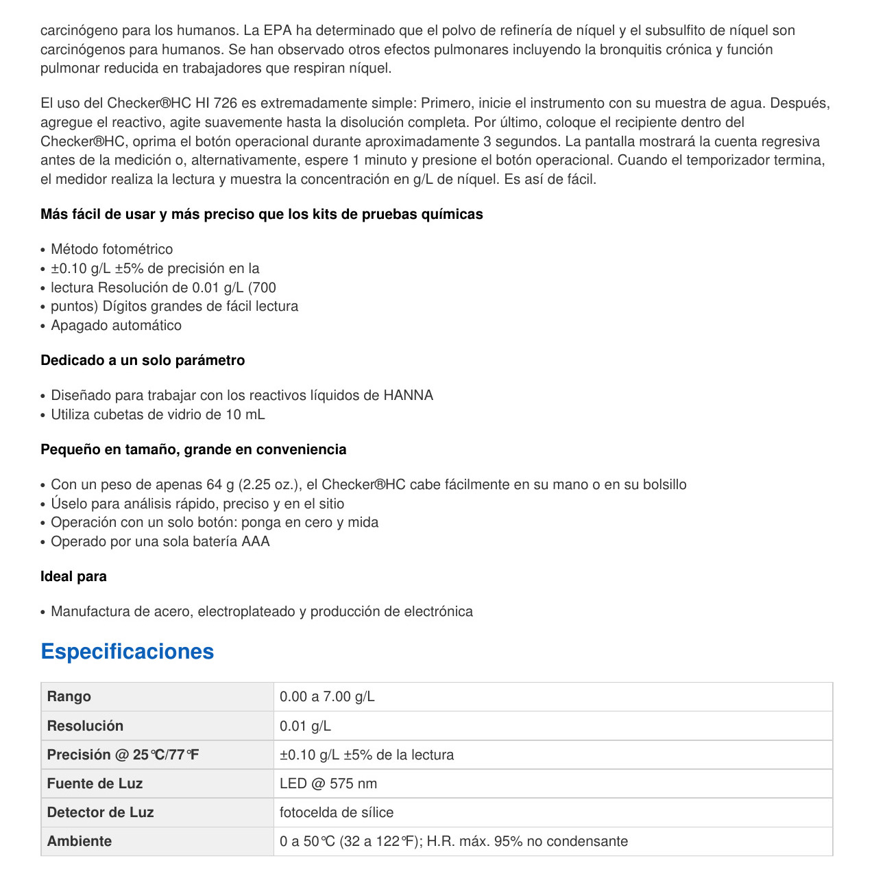 El HI726 Comprobador ® HC (orientable Colorímetro) proporciona una manera simple, precisa y rentable para medir níquel. Comúnmente utilizado por las industrias de la galvanoplastia y la batería, el níquel se controla activamente en las aguas residuales debido al daño que puede causar a las plantas y la vida acuática. Diseñado como una alternativa más precisa a los kits de pruebas químicas, el HI726 brinda resultados rápidos y precisos en unos pocos y sencillos pasos.