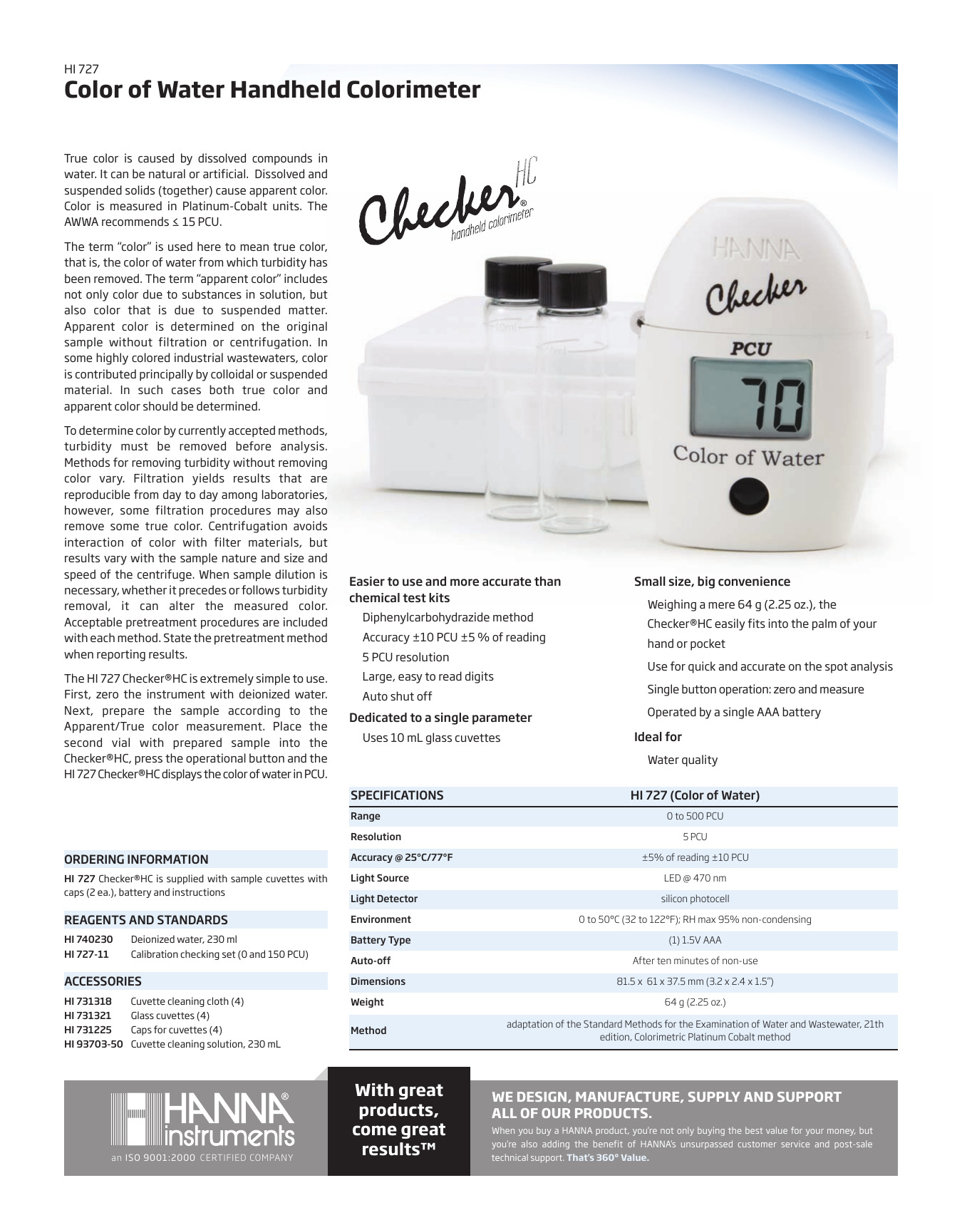 Información sobre pedidos HI727 Checker® se suministra con (2) cubetas de muestra con tapas, batería, instrucciones y guía de inicio rápido