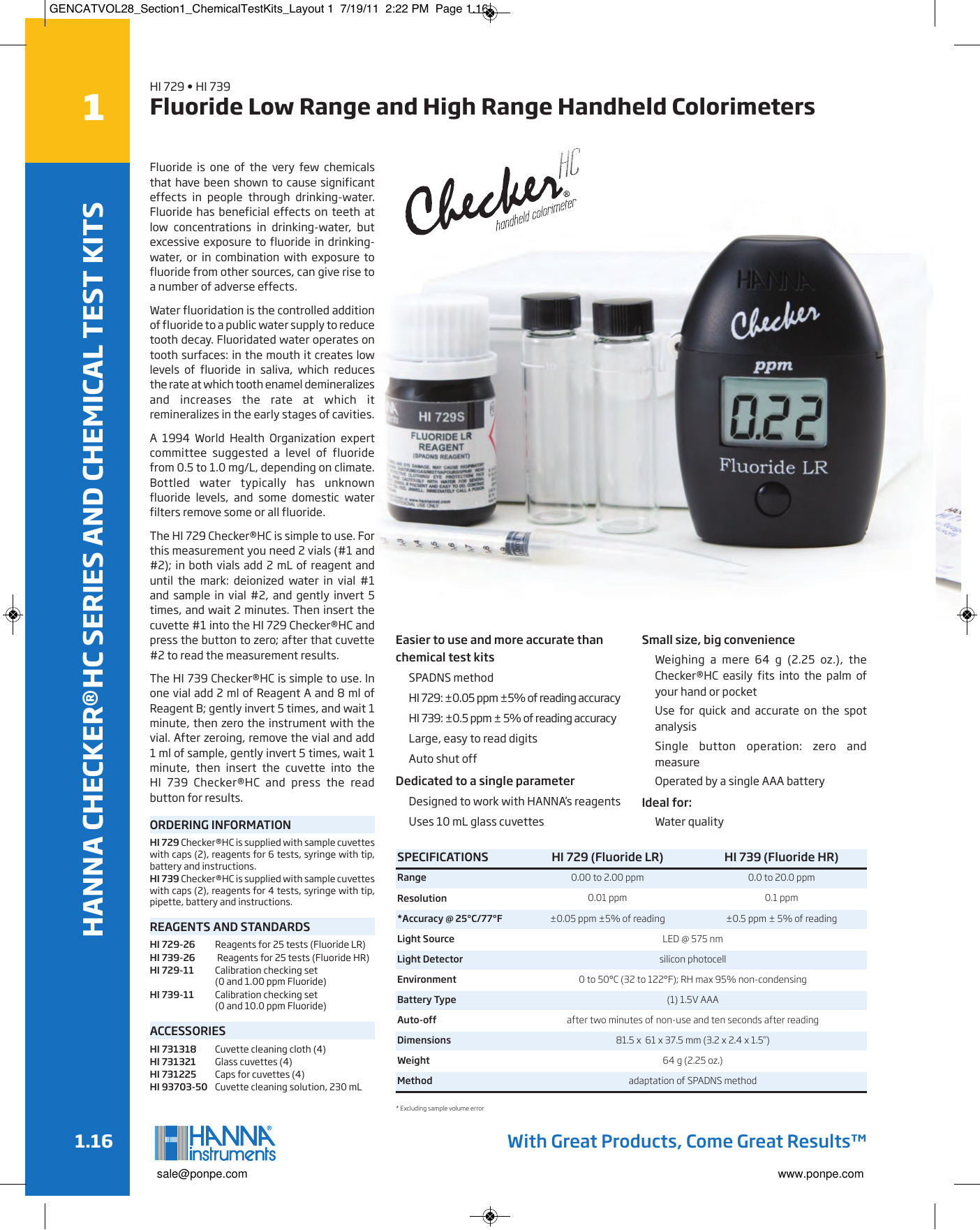 Información para ordenar El Checker® HI739 se suministra con celdas para muestra con tapas (2), kit de reactivos de arranque de fluoruro IA para 15 pruebas (1 botella de reactivo A de fluoruro IA, 1 botella de reactivo B de fluoruro IA), jeringa de 1 mL con punta (2), pipeta, batería, instrucciones y guía de inicio rápido.
