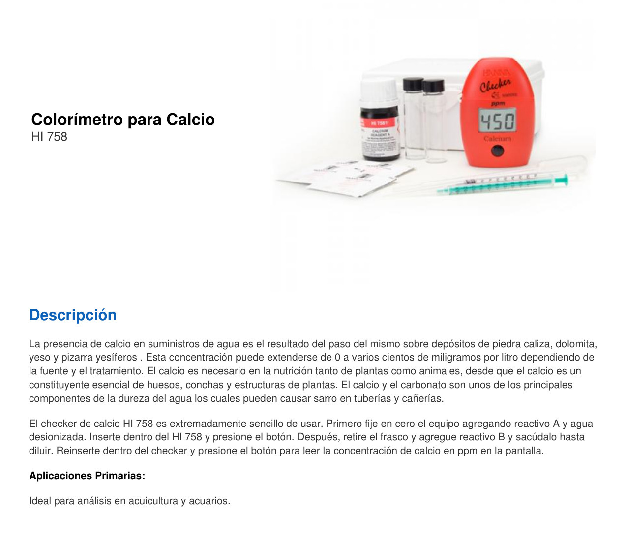 El HI758U Comprobador ® HC (orientable Colorímetro) proporciona una manera simple, precisa y rentable para medir el calcio. Requerido para el desarrollo de esqueletos de carbonato de calcio de los arrecifes de coral, el calcio es un componente crucial de las aguas marinas. Diseñado como una alternativa más precisa a los kits de pruebas químicas, el HI758U brinda resultados rápidos y precisos en unos pocos y sencillos pasos.
