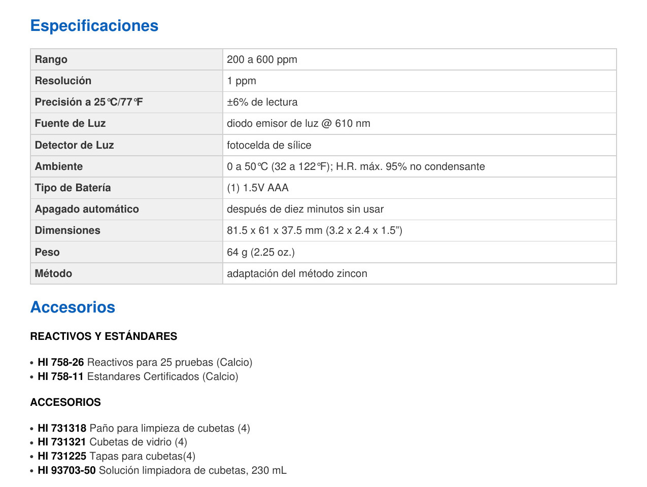 Información sobre pedidos HI758 Calcium Checker se suministra con (2) cubetas de muestra con tapas, kit de inicio de reactivo de calcio para 25 pruebas, gotero, jeringa de 1 ml con punta, pipeta de 100 microlitros con punta, pipeta de plástico, batería, instrucciones y guía de inicio rápido.