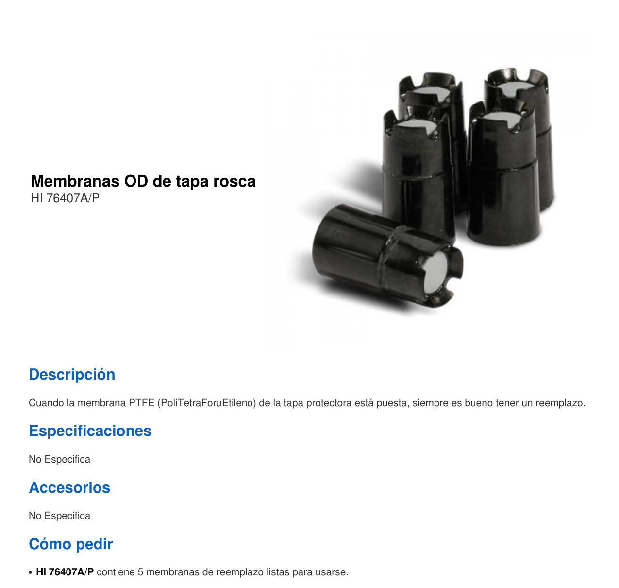 El HI76407A / P son membranas de tapón de rosca de oxígeno disuelto diseñadas especialmente para las sondas de oxígeno disuelto polarográficas portátiles de Hanna. Las tapas están hechas de plástico ABS duradero con membranas permeables al oxígeno con politetrafluoroetileno (PTFE). Las membranas separan las sondas cátodo y ánodo del agua que se está midiendo. El oxígeno se difunde a través de la membrana e interactúa con el sistema polarográfico para producir una corriente proporcional a la concentración de oxígeno. Cada tapa se llena fácilmente con electrolito HI7041 y se atornilla a la sonda.