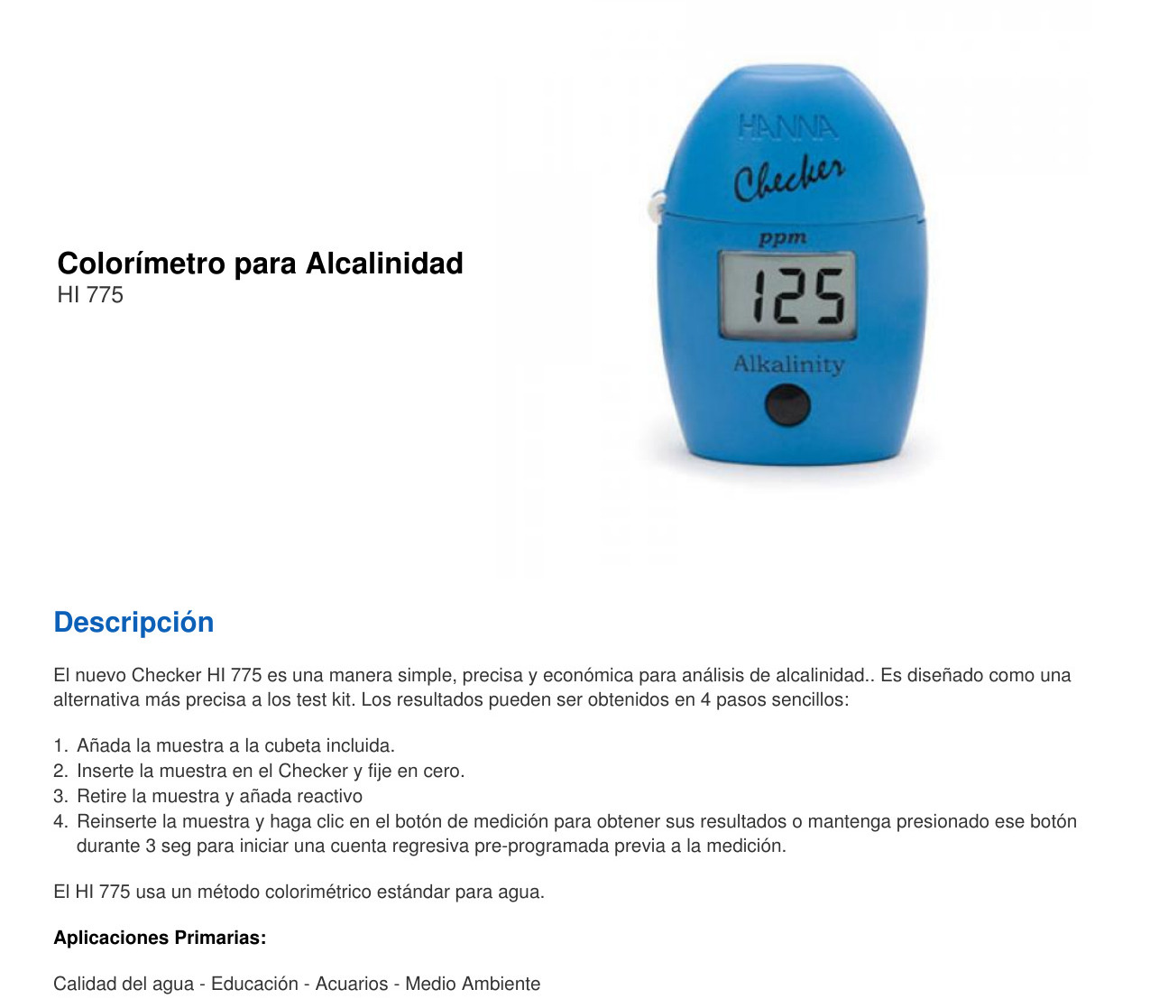 El HI 775 utiliza un método colorimétrico. La reacción produce una gama distintiva de colores desde el amarillo al azul de desarrollar. Este medidor ha sido desarrollado para trabajar con muestras de agua dulce.