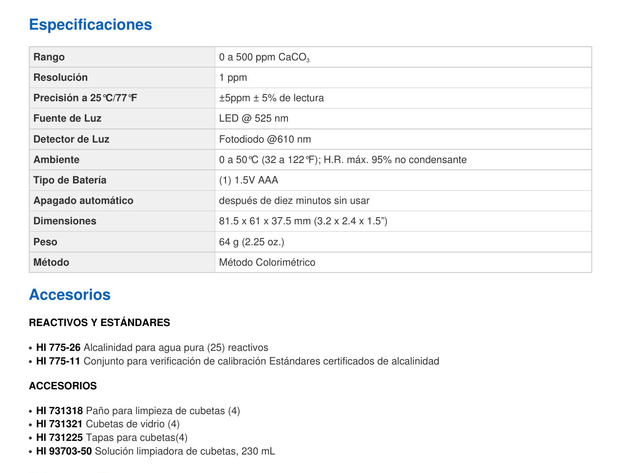 Información sobre pedidos HI775 Checker® se suministra con (2) cubetas de muestra con tapas, kit de inicio de reactivo de alcalinidad para 25 pruebas (1 botella de reactivo de alcalinidad), (1) jeringa y punta de 1 ml), batería, instrucciones y guía de inicio rápido.