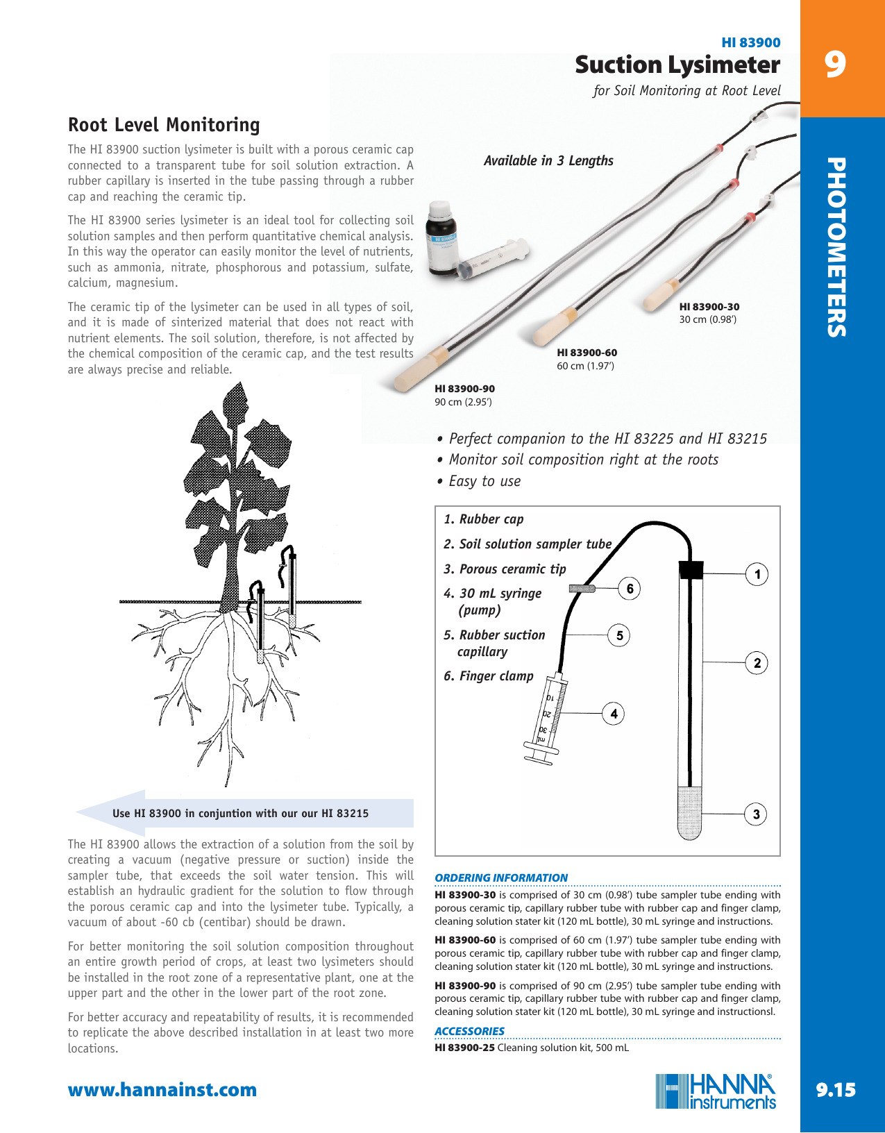 Hanna ofrece el HI83900 en tres longitudes diferentes: 30 cm, 60 cm o 90 cm. No importa cuál sea la profundidad del nivel de la raíz, los usuarios pueden extraer fácilmente una solución de suelo que representa la concentración de nutrientes disponibles para la absorción de la planta.
