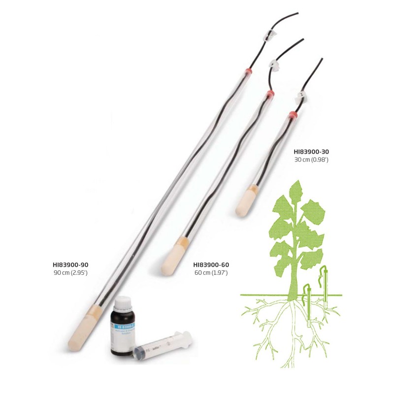 Hanna ofrece el HI83900 en tres longitudes diferentes: 30 cm, 60 cm o 90 cm. No importa cuál sea la profundidad del nivel de la raíz, los usuarios pueden extraer fácilmente una solución de suelo que representa la concentración de nutrientes disponibles para la absorción de la planta.