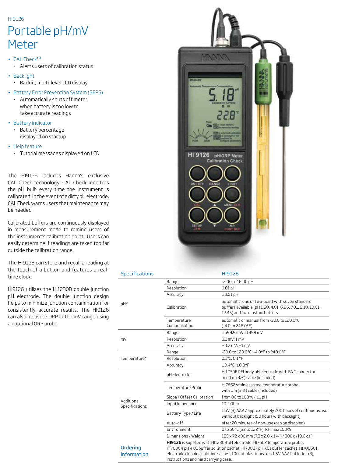 El HI 9126 incluye la tecnología de Calibración CheckTM exclusiva de HANNA. La Calibración CheckTM monitorea el bulbo de pH y la unión de referencia del electrodo, el instrumento es calibrado todo el tiempo. En caso de que el electrodo de pH se encuentre sucio, la Calibración CheckTM alerta a los usuarios de se es necesario hacer mantenimiento sobre el instrumento.