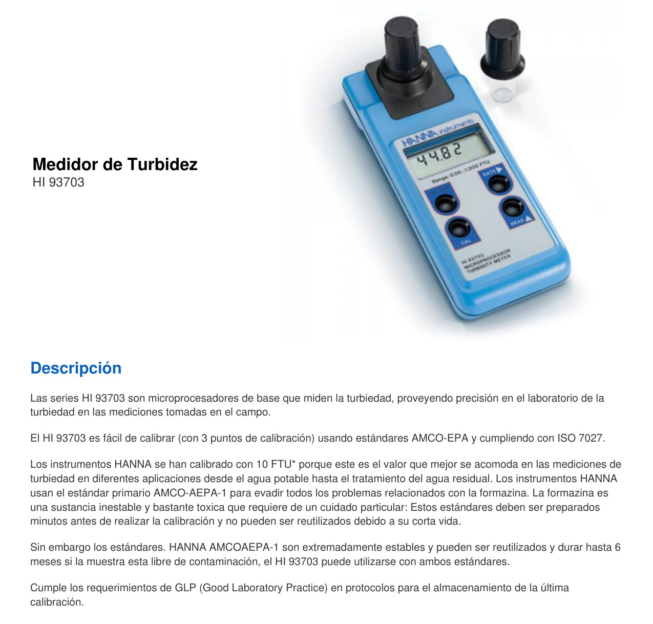 TURBIDIMETROS – > MARCA: HANNA -> MODELO: HI93703 ; realizamos entrega en las ciudades de Lima, Arequipa, Cusco , Moquegua , Tacna , Ica , Chiclayo , Trujillo, Cajamarca, Piura, Tumbes, iquitos, Huancayo , Ayacucho , Pucallpa, Huanuco , Cerro de Pasco ; llevamos mas de 10 años comercializando HANNA en Peru , somos especialistas importando turbidimetros, equipos de medicion , turbidimetro portatil, turbidimetro digitalTurbidímetro Portátil HANNA HI93703