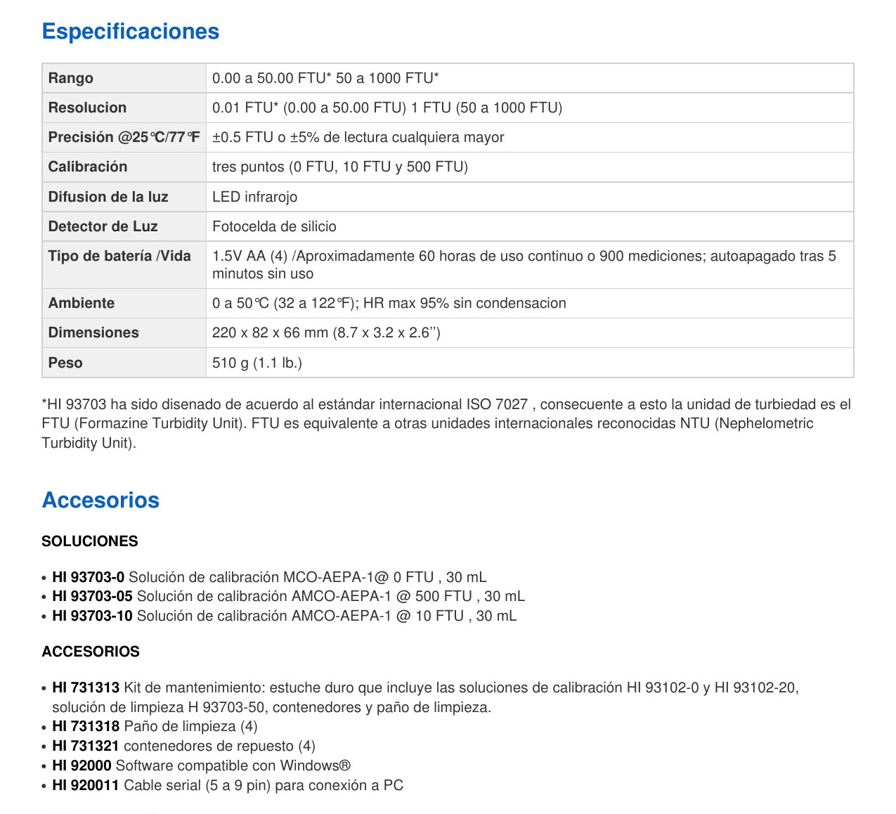 Cumple con ISO : el HI93703 cumple y excede los requisitos del método ISO 7027 para mediciones de turbidez mediante el uso de una fuente de luz LED infrarroja. Como este medidor ha sido diseñado para seguir este método ISO, las unidades se muestran en FTU (Unidad de turbidez de formazina); FTU es equivalente a la otra unidad reconocida internacionalmente de NTU (Unidad de Turbidez Nefelométrica).