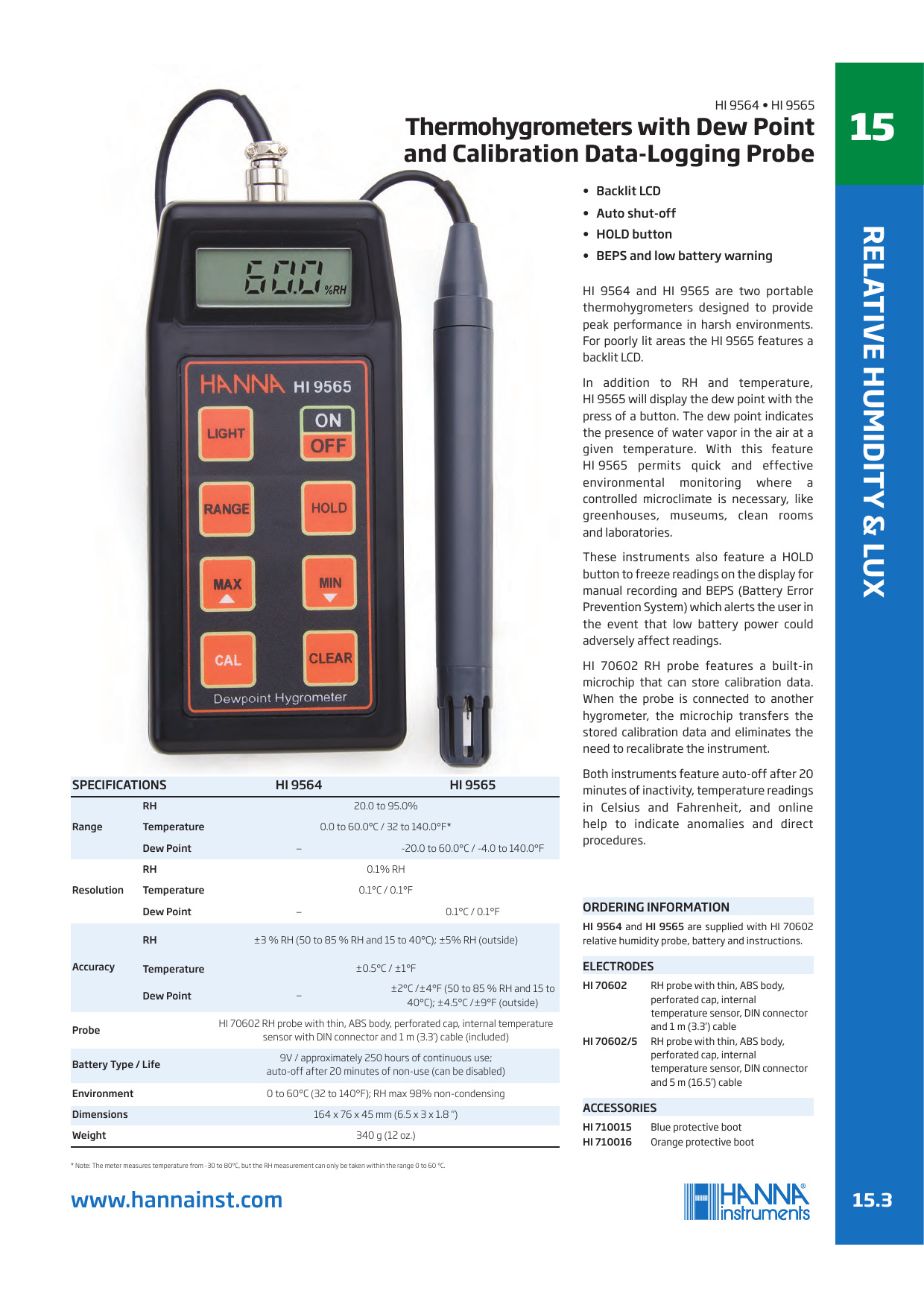 Información sobre pedidos HI9564 se suministra con HI70602 HR / sonda de temperatura, batería de 9V (1) y manual de instrucciones.