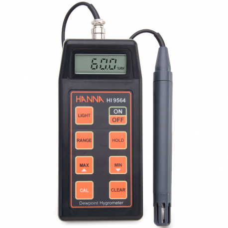 HI9564 es un termohigrómetro portátil diseñado para proporcionar el máximo rendimiento en ambientes hostiles. Las mediciones de temperatura y humedad relativa se facilitan con la carcasa robusta y resistente al agua del medidor y la carcasa duradera de la sonda HI70602. HI9564 presenta una función de apagado automático después de 20 minutos de inactividad, lecturas de temperatura en grados Celsius y Fahrenheit, y mensajes en pantalla para dirigir los procedimientos e indicar posibles errores.