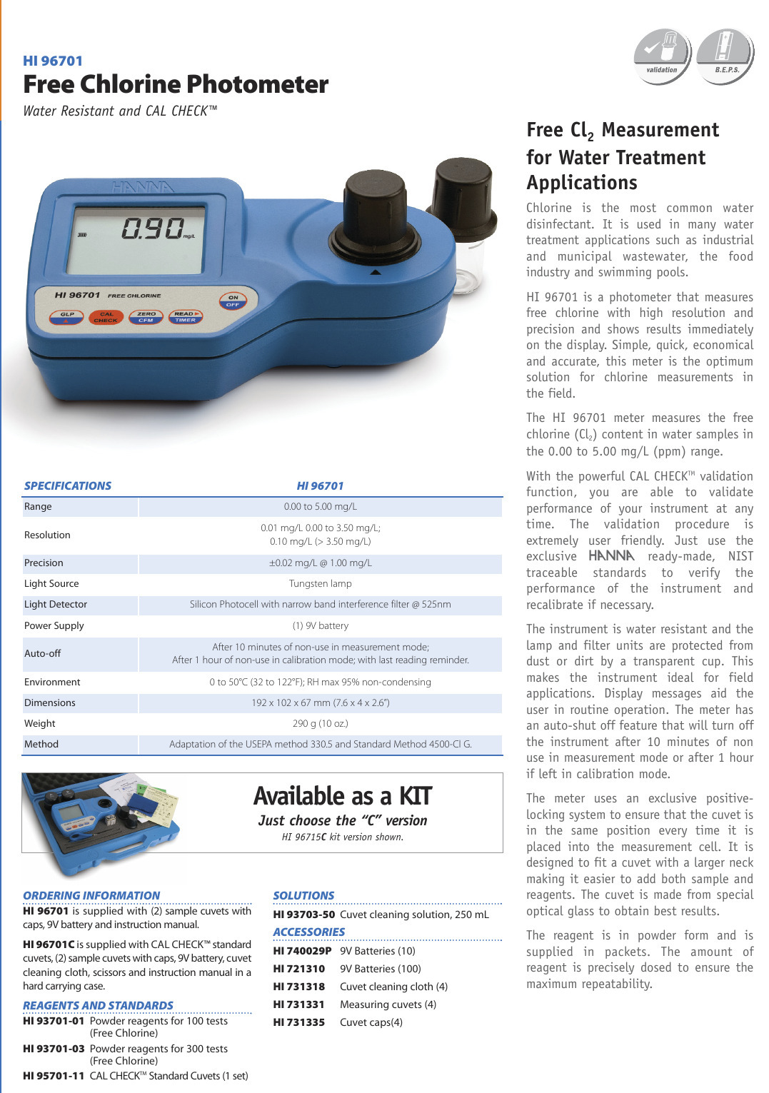 El HI96701 está disponible como un kit (HI96701C) que incluye: