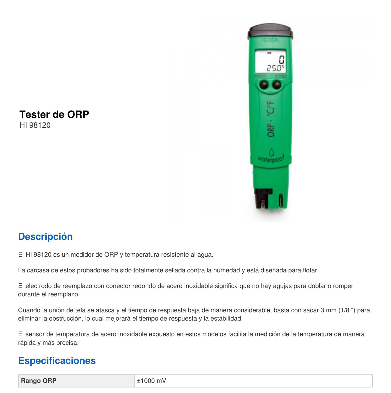 El HI98120 (ORP) se suministra con electrodo de ORP HI 73120, herramienta de extracción de electrodo HI 73128, baterías y manual de instrucciones VIDEO REFRENCIAL: