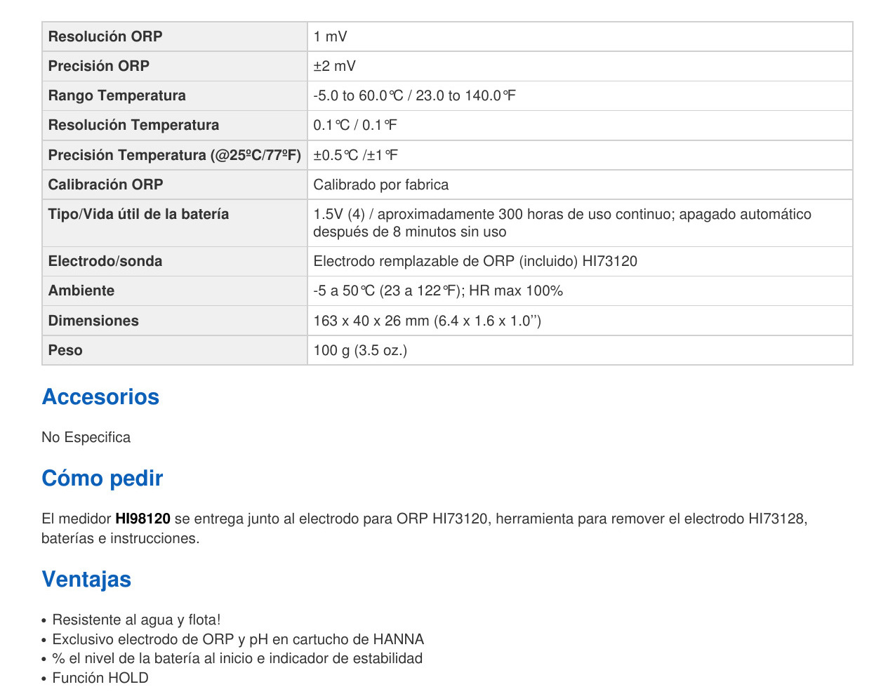El HI98120 (ORP) se suministra con electrodo de ORP HI 73120, herramienta de extracción de electrodo HI 73128, baterías y manual de instrucciones