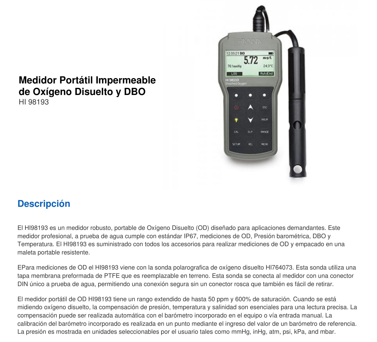 MEDIDOR DE OD HANNA – > MARCA: HANNA -> MODELO: HI98193 ; realizamos entrega en las ciudades de Lima, Arequipa, Cusco , Moquegua , Tacna , Ica , Chiclayo , Trujillo, Cajamarca, Piura, Tumbes, iquitos, Huancayo , Ayacucho , Pucallpa, Huanuco , Cerro de Pasco ; llevamos mas de 10 años comercializando HANNA en Peru , somos especialistas importando medidor de od hanna, equipos de medicion , medidor de od, medidor de oxigeno disueltoMedidor Impermeable portátil Oxigeno Disuelto HANNA – HI98193
