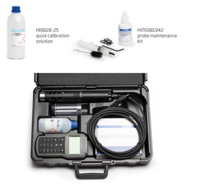 Estuche de transporte termoformado resistente : el medidor HI98196, la sonda y todos los accesorios se suministran en un estuche de transporte resistente diseñado para brindar años de uso. El compartimiento interior del estuche de transporte está termoformado para sujetar y proteger de manera segura todos los componentes.