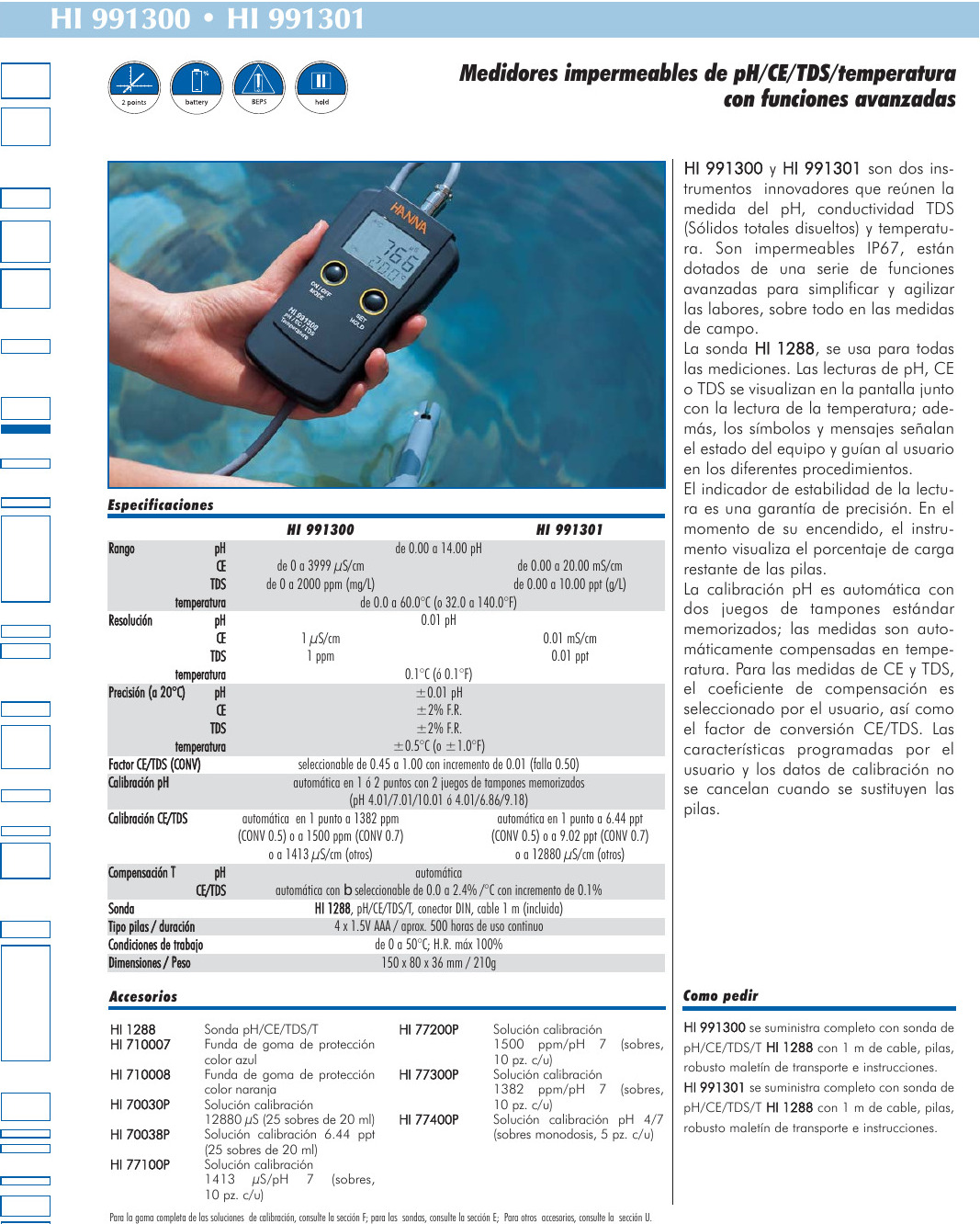 Cada medidor se suministra completo con sonda HI1288, baterías, robusto maletín de transporte y manual de instrucciones.
