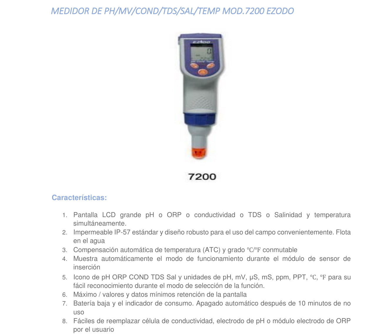 MEDIDOR DE PH – > MARCA: EZDO -> MODELO: 7200 ; realizamos entrega en las ciudades de Lima, Arequipa, Cusco , Moquegua , Tacna , Ica , Chiclayo , Trujillo, Cajamarca, Piura, Tumbes, iquitos, Huancayo , Ayacucho , Pucallpa, Huanuco , Cerro de Pasco ; llevamos mas de 10 años comercializando EZDO en Peru , somos especialistas importando medidor de ph, medidor multiparametrico , medidor de orp, medidor de solidos totales disueltos Medidor de pH/CE/Salinidad/TDS/ORP/Temperatura EZDO – 7200
