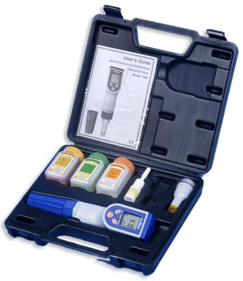 MULTIPARAMETRO resistente al agua, sirve para medir el pH, la conductividad, sólidos totales disueltos, la salinidad y a temperatura. Al conectar el pH-metro se llevará a cabo una auto revisión para poder asegurar la precisión en la medición. El pH-metro está equipado con un indicador de estabilidad. Los factores EC / TDS y de compensación de temperatura pueden ser adaptados a las condiciones ambientales. En la calibración del valor del pH se podrán elegir diferentes limitaciones estándar. El pH-metro Combo posee un soporte de electrodos en el que se encuentra el electrodo para el pH y un electrodo para la conductibilidad y la salinidad que se pueden intercambiar fácilmente.